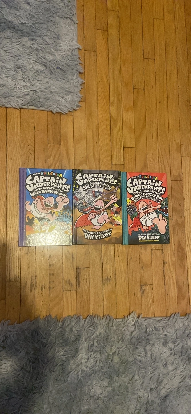 Three Captain Underpants books. Titles include: And the Wrath of the Wicked Wedgie Woman, Sir Stinks-a-Lot, and The Big, Bad Battle of the Bionic Booger Boy. Written by Dav Pilkey.