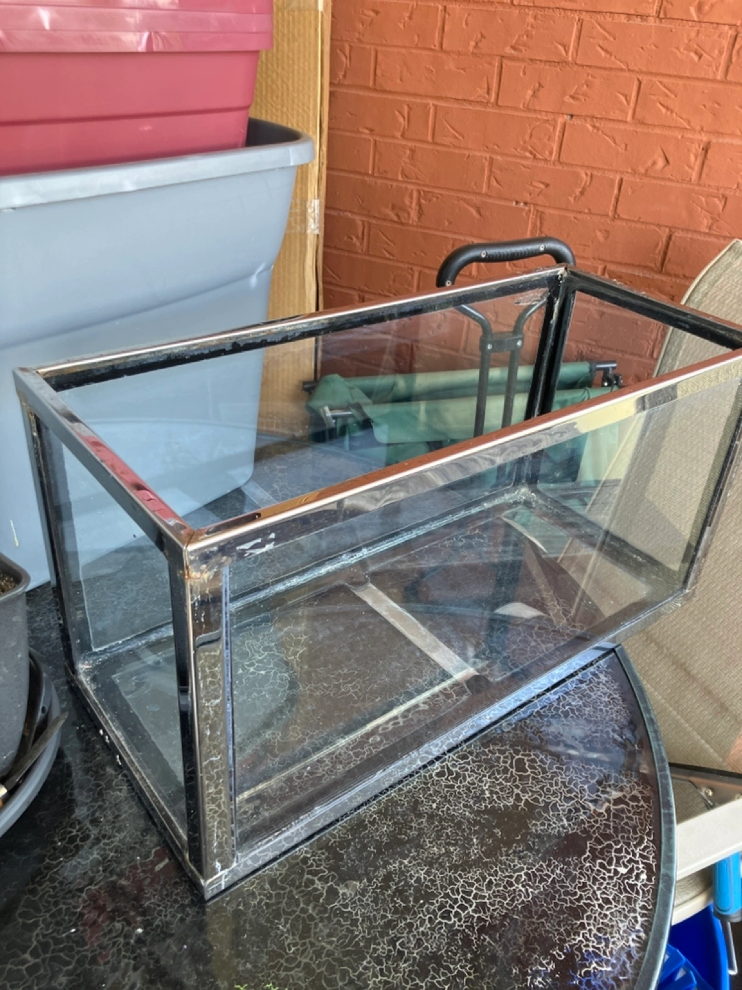 Small glass aquarium tank. Good for small fish or reptiles. Shows some wear. Just the empty tank nothing included.