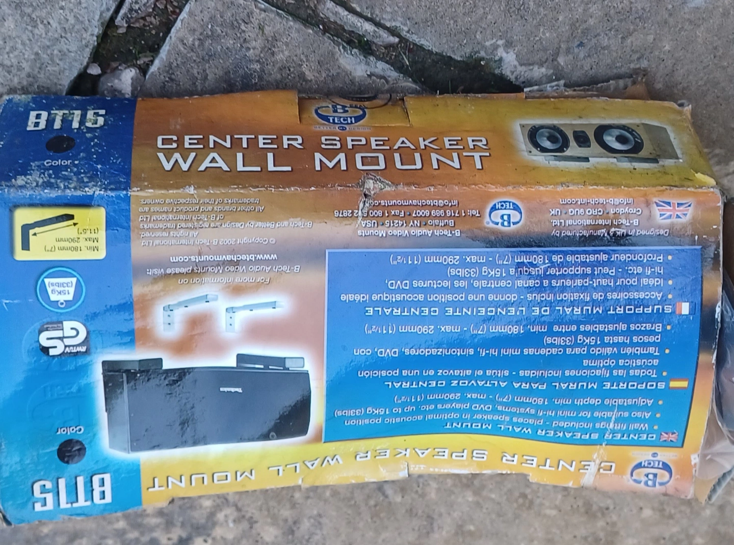 New in box, B-Tech BT15 center speaker wall mount. Includes all mounting hardware. Supports multiple speaker sizes.