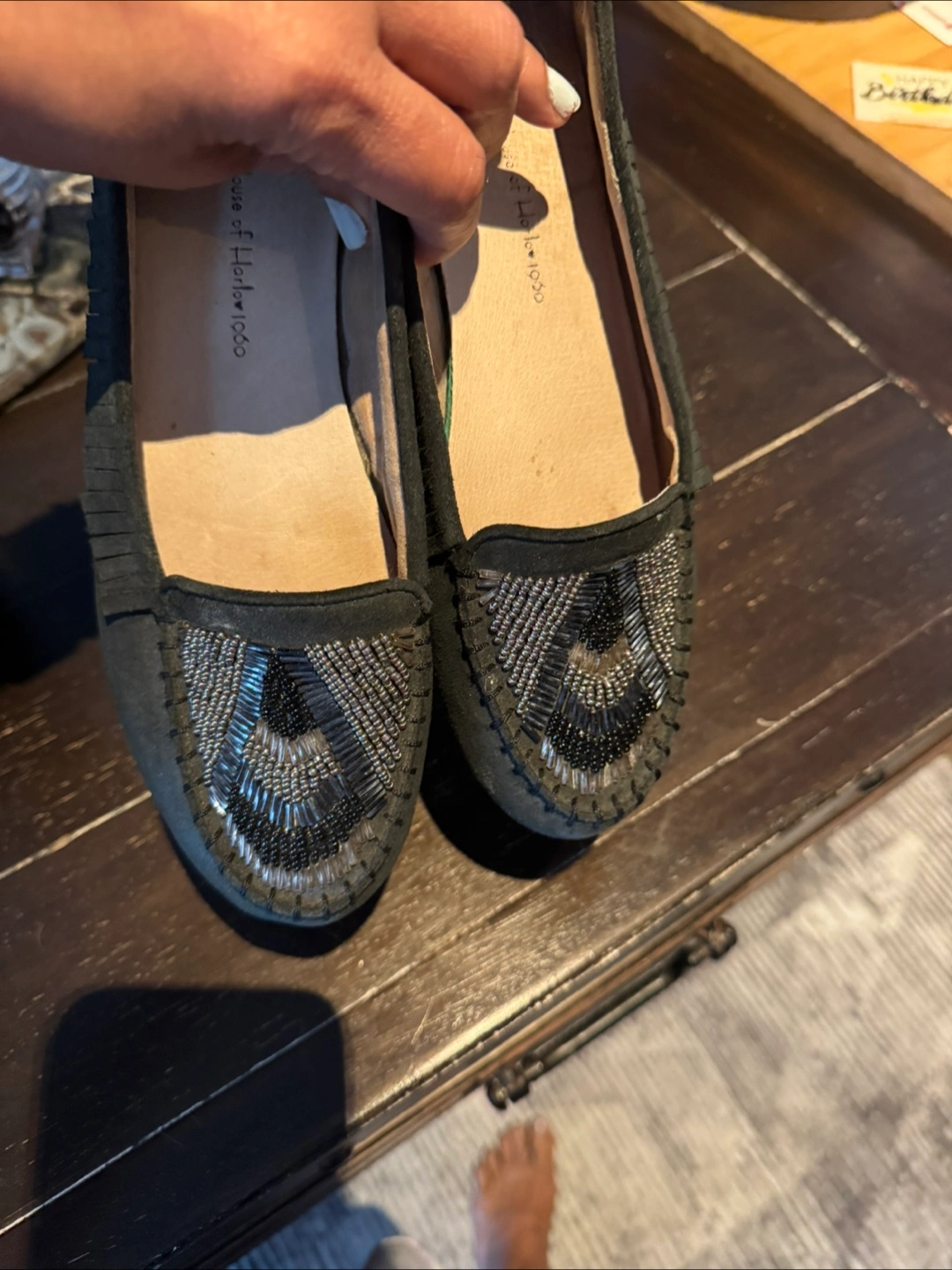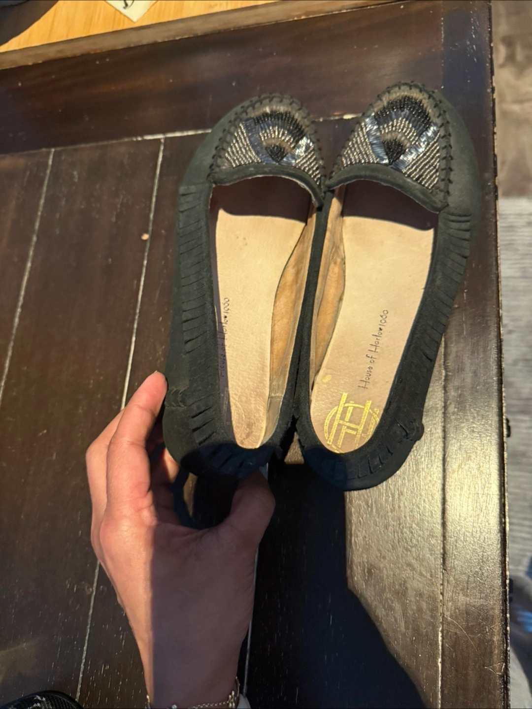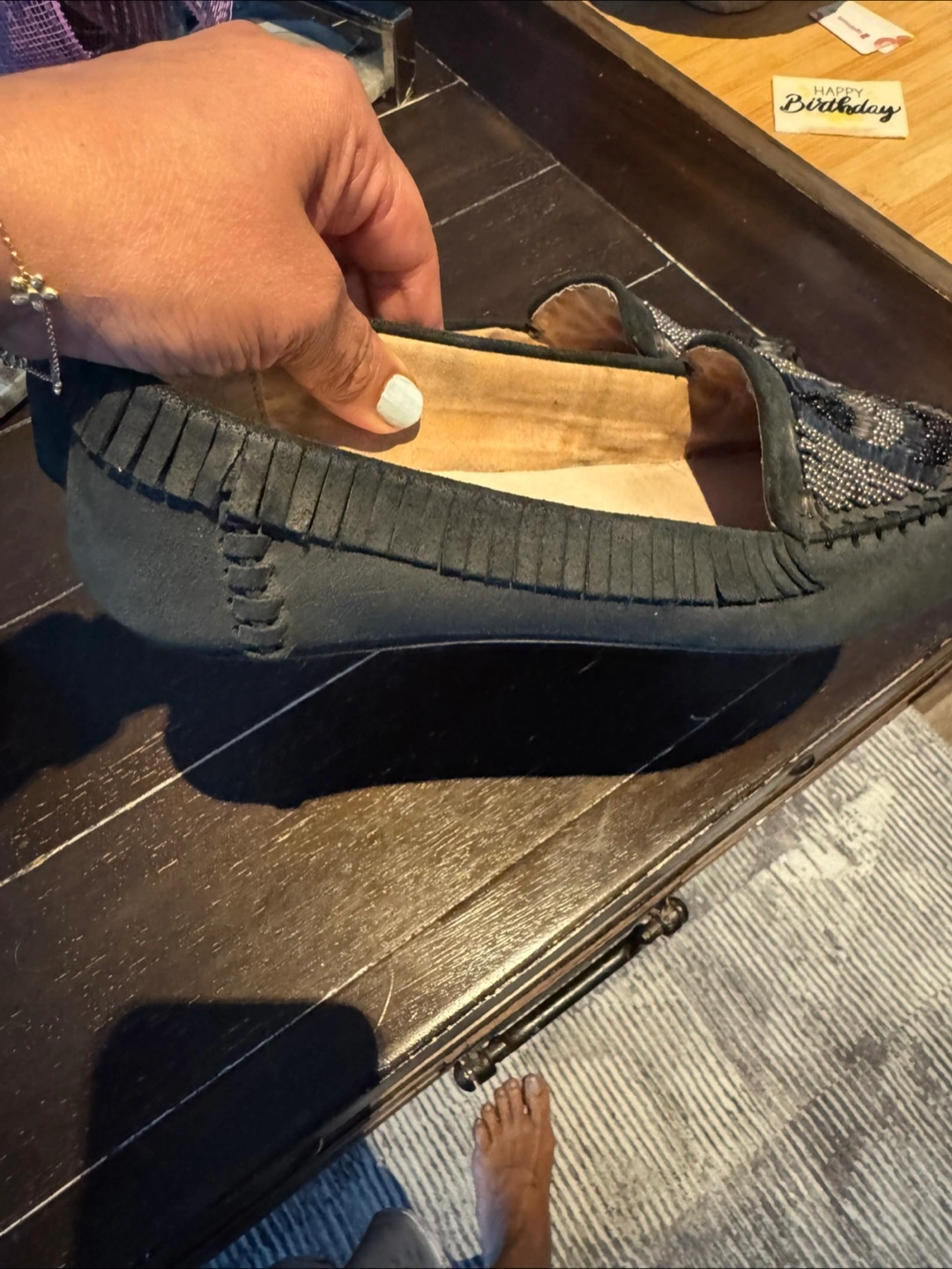 Women's black suede loafers. Sequined detail on the toe. Fringe detailing around the collar. Size 8.