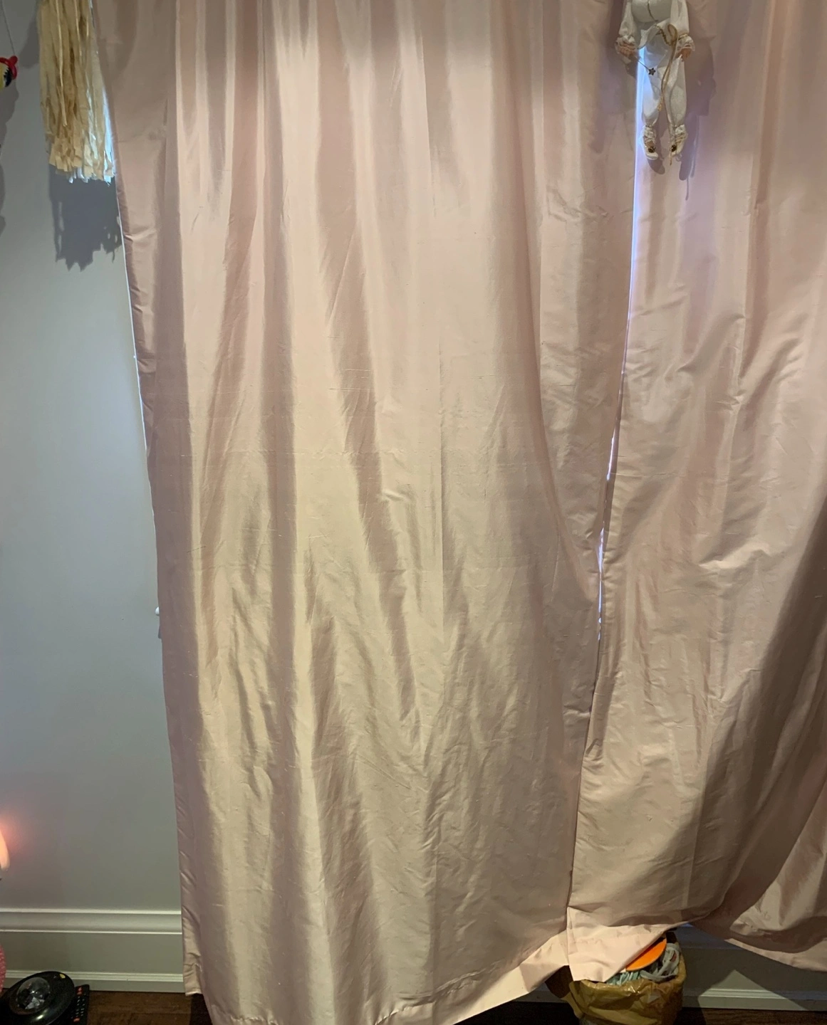 93Beautiful pink blackout curtains. Silky fabric. Dry clean only. Measurements: 44x84 inches or 112x213cm. Gently used. From a smoke-free home.