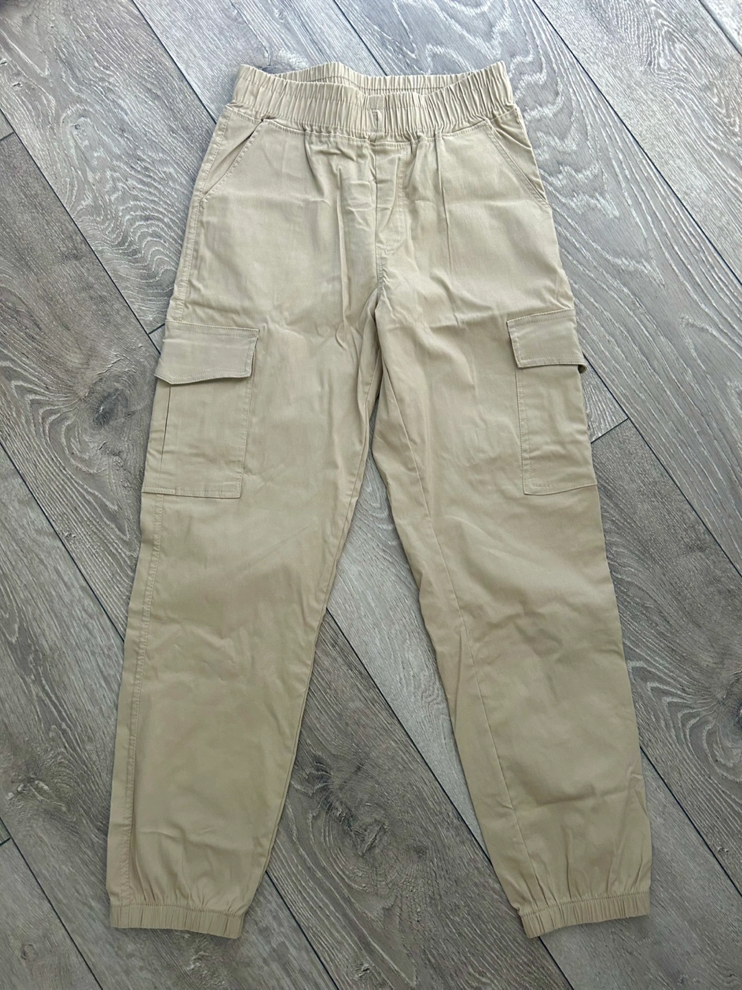 Beige cargo pants with elastic waistband and two pockets on the side. Great for casual wear!