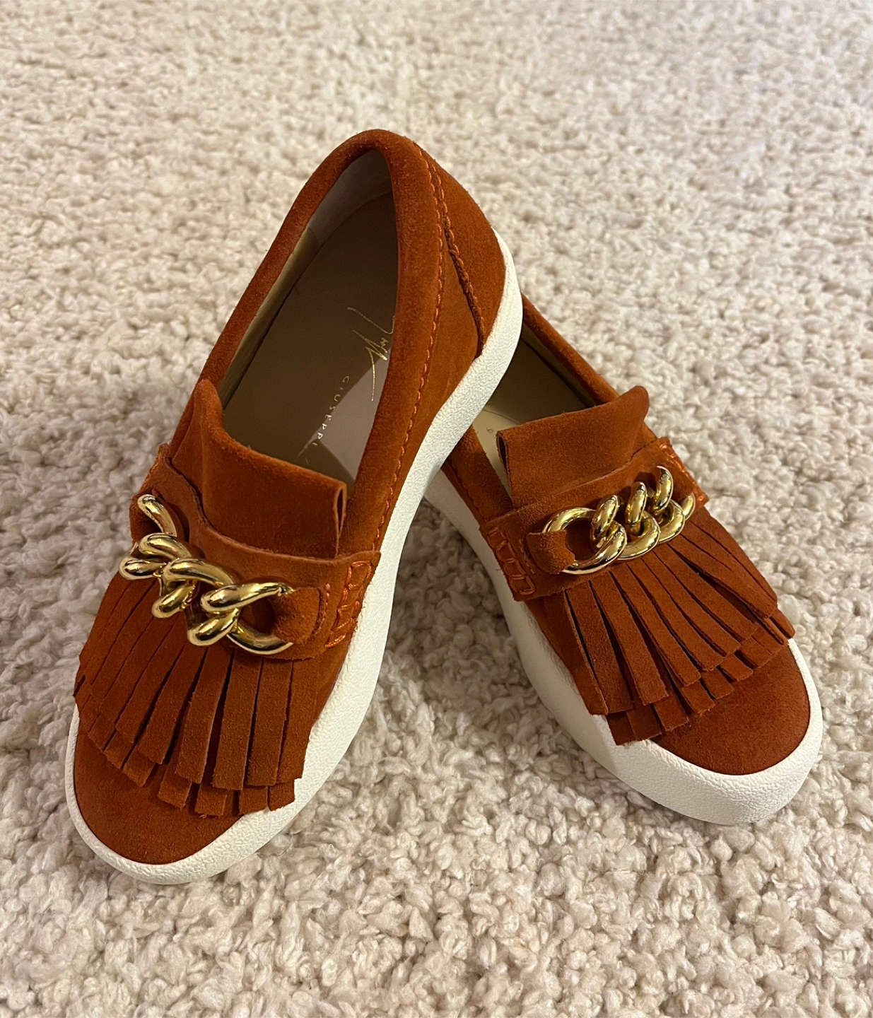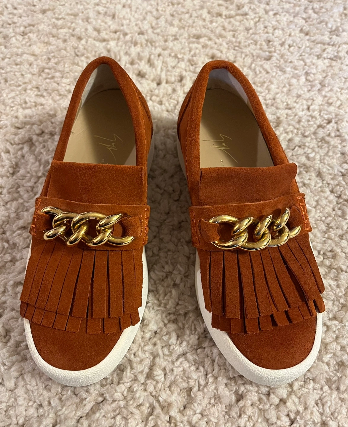 Designer Brown suede luxury loafers shoes with gold chain accent and fringe detail White platform sole Excellent condition, like new Women Size 5- 6 Pick Up Bloor and Islington Etobicoke