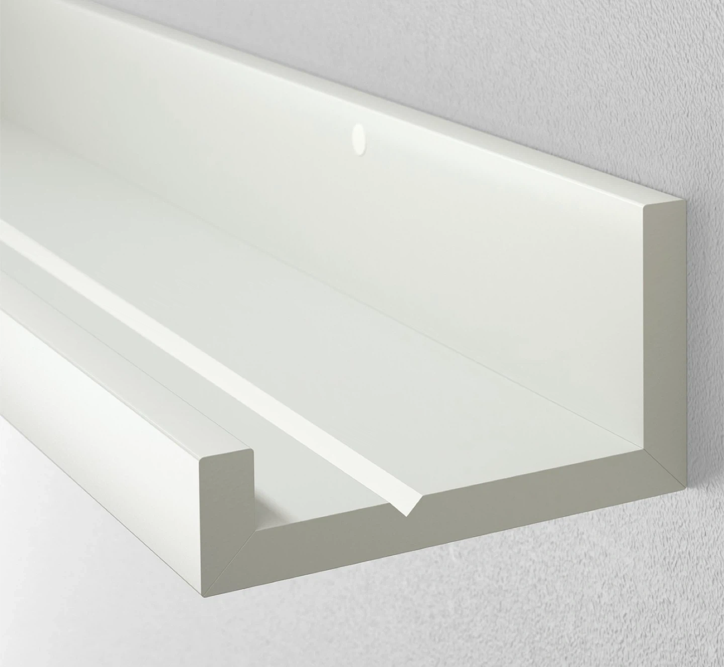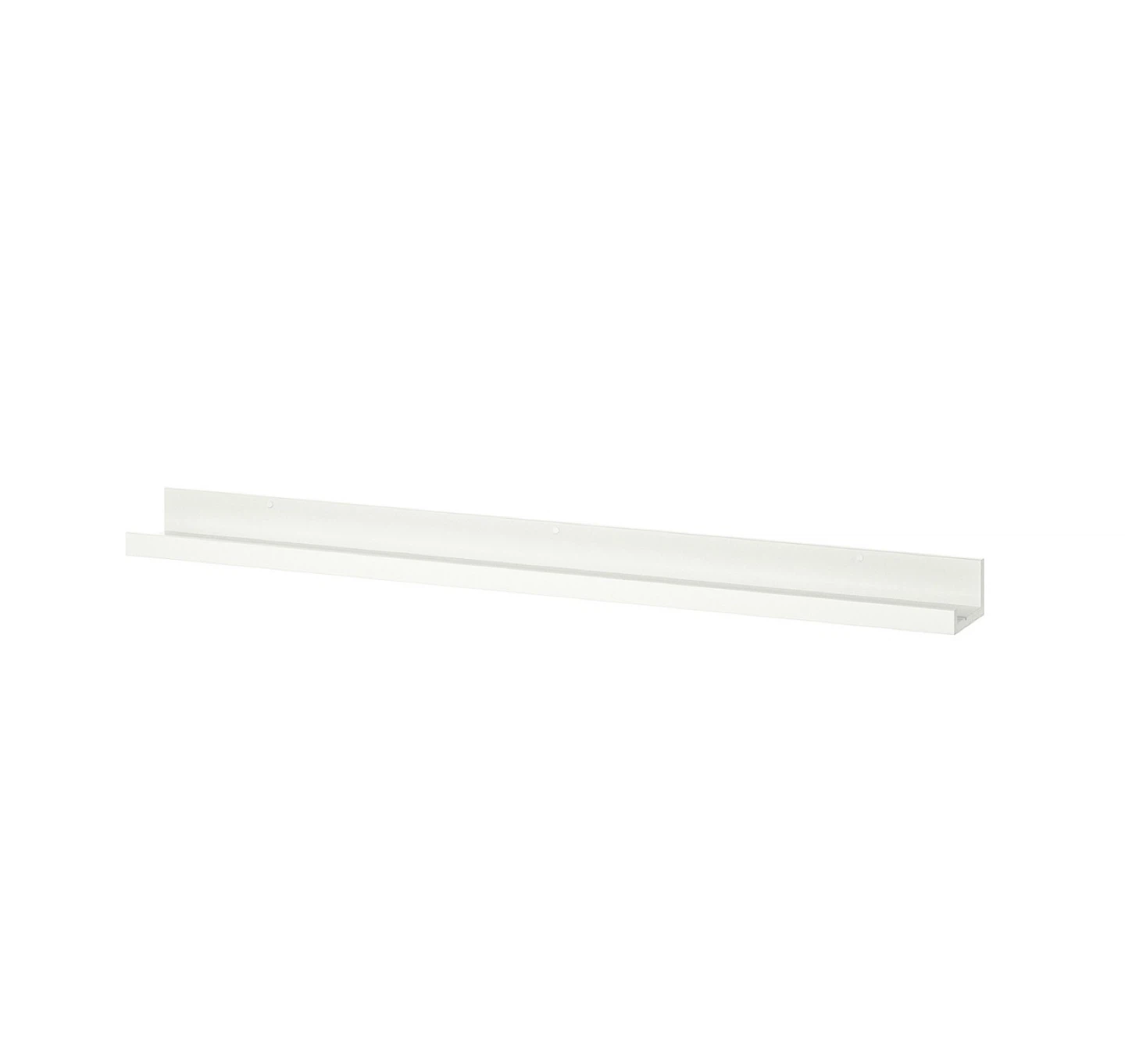 White picture ledge. Long and narrow. Great for displaying photos or small items. Pre-drilled holes for easy installation.