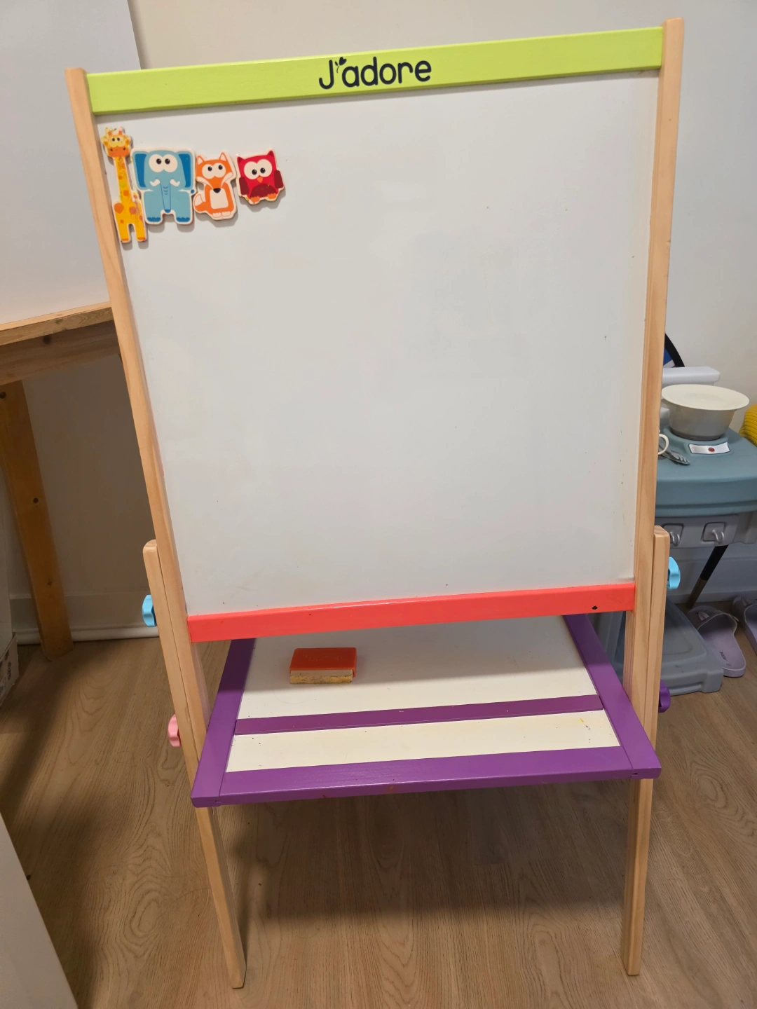 Children's easel. Features a whiteboard and chalkboard. Wooden construction. Includes eraser and animal-shaped magnets. Colourful design. Great for creative play.