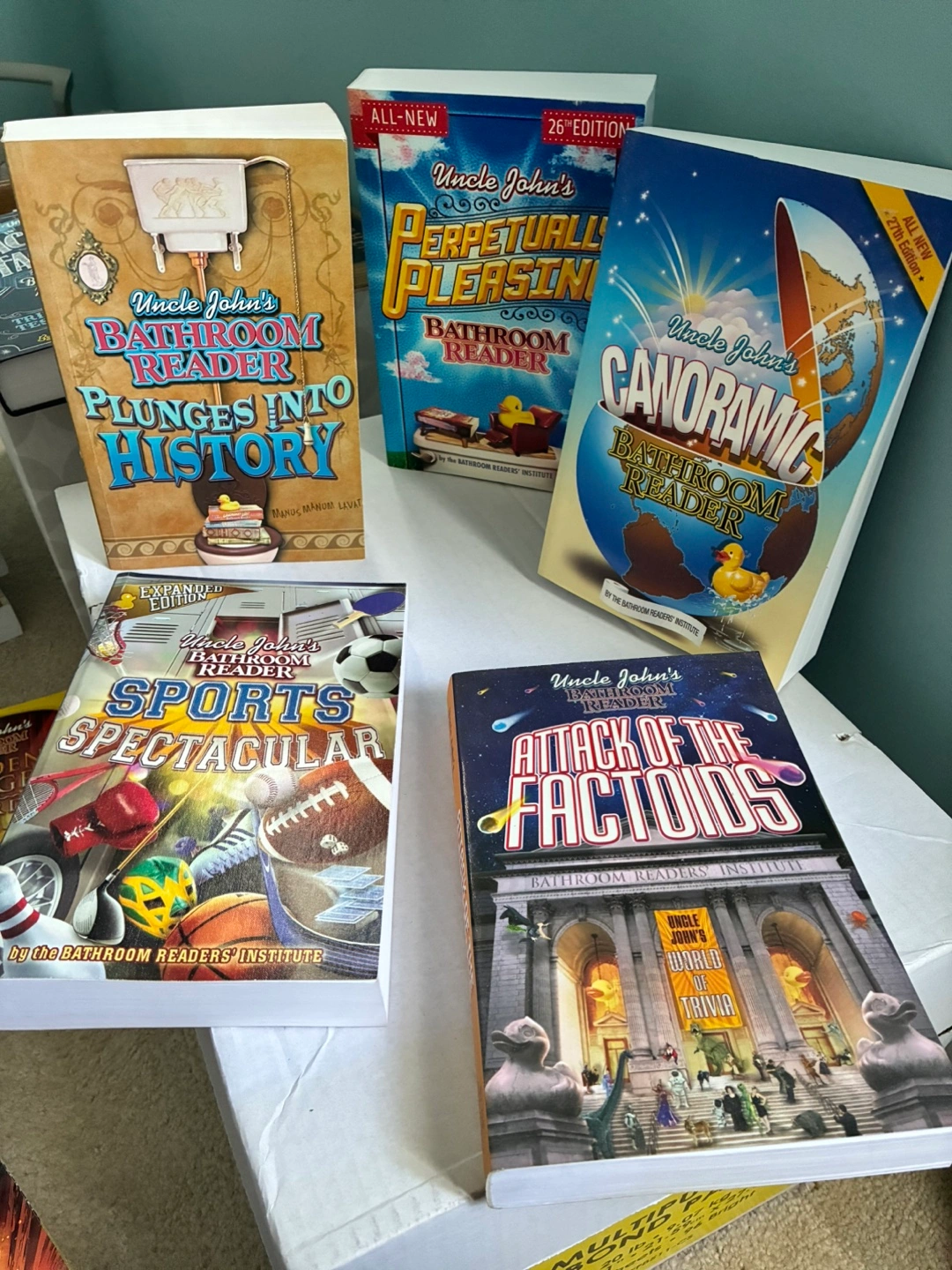 Set of five Uncle John's Bathroom Reader books. Titles include Plunges into History, Perpetually Pleasing, Panoramic, Sports Spectacular, and Attack of the Factoids. All by the Bathroom Readers' Institute.