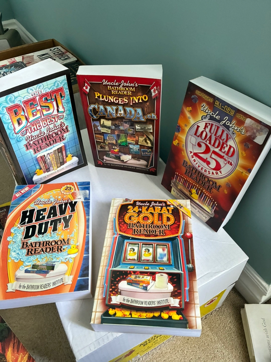 Five different Uncle John's Bathroom Reader books. Titles include: The Best of the Best, Plunges into Canada, Fully Loaded 25th Anniversary, Heavy Duty, and 24-Karat Gold. Great for bathroom humour and trivia.