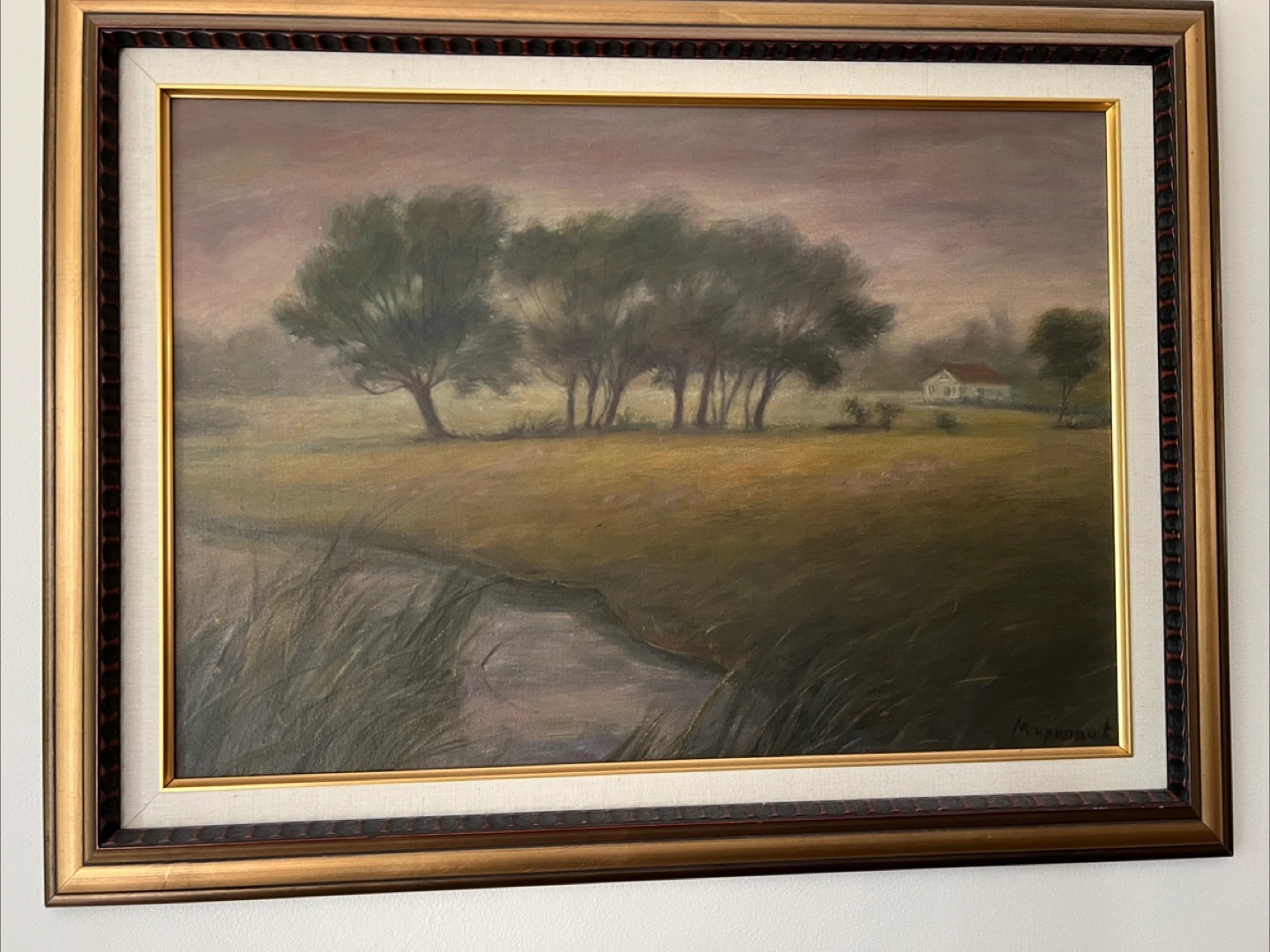 Oil painting on canvas. Depicts a tranquil landscape with trees and a house. Presented in a dark brown wooden frame. Artist signature visible.