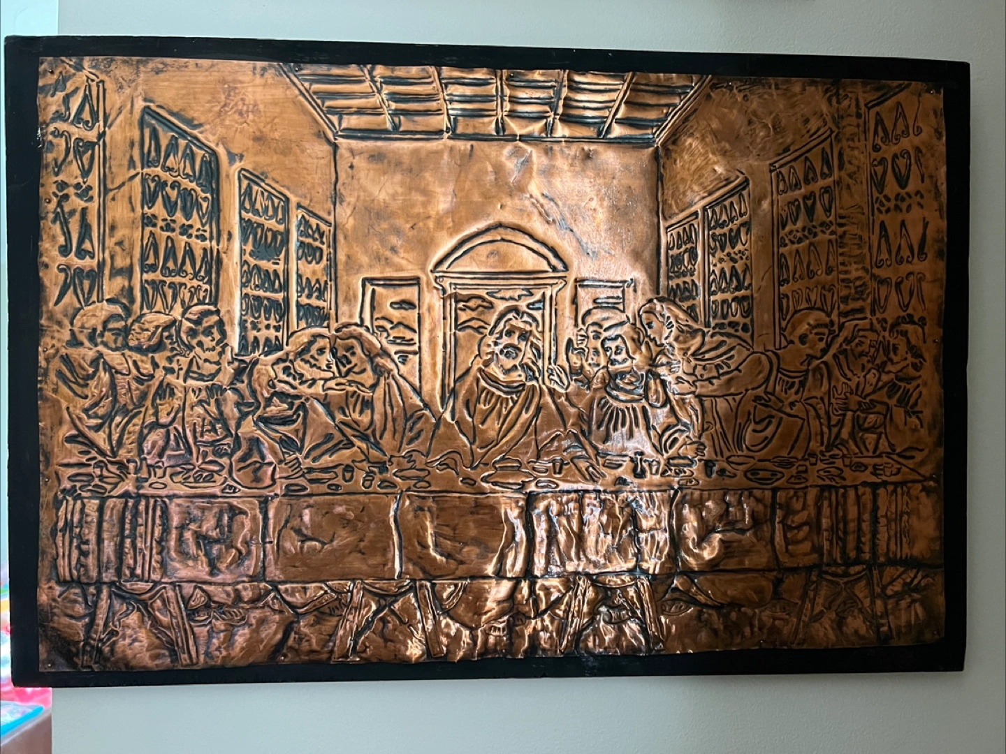 Hand-crafted copper wall art depicting Leonardo da Vinci's The Last Supper. Features embossed detailing. Unique piece for home décor. 19.75” x 12.75”
