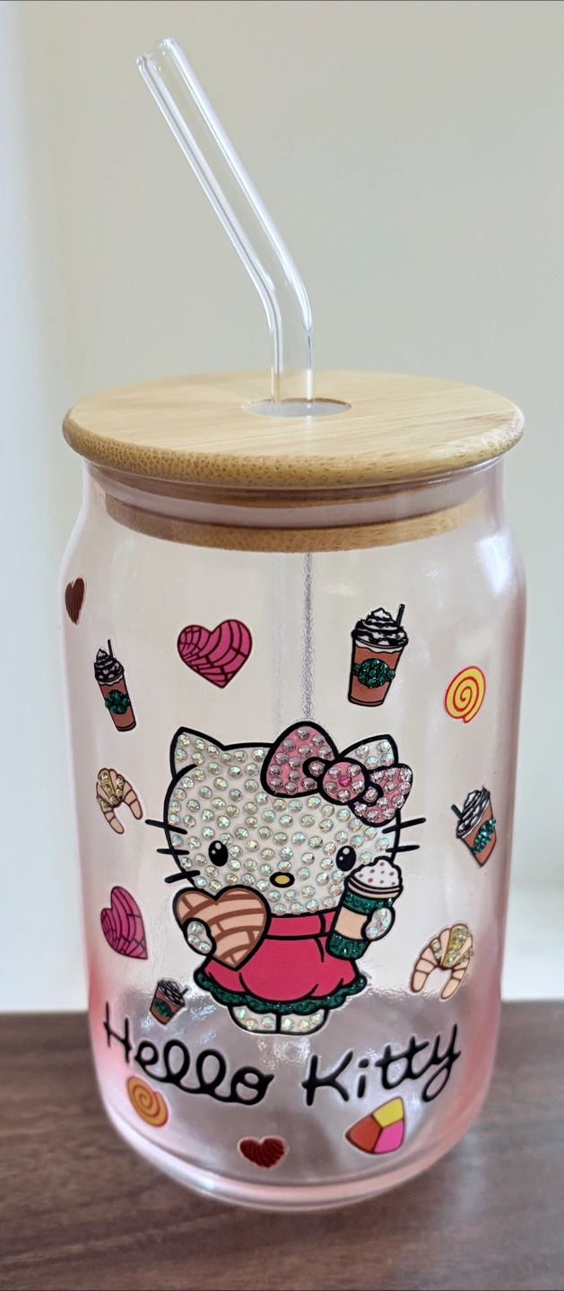 Cute Hello Kitty themed glass tumbler. Features a pink ombre design, bamboo lid, and clear straw. Embellished with rhinestones. Starbucks-inspired imagery.