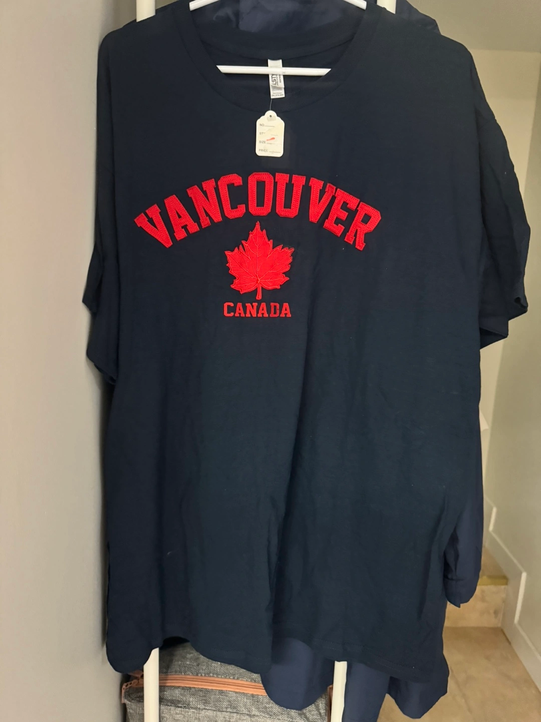 Navy blue t-shirt. Features red Vancouver lettering and a red maple leaf with Canada written below. Short sleeves, crew neck.