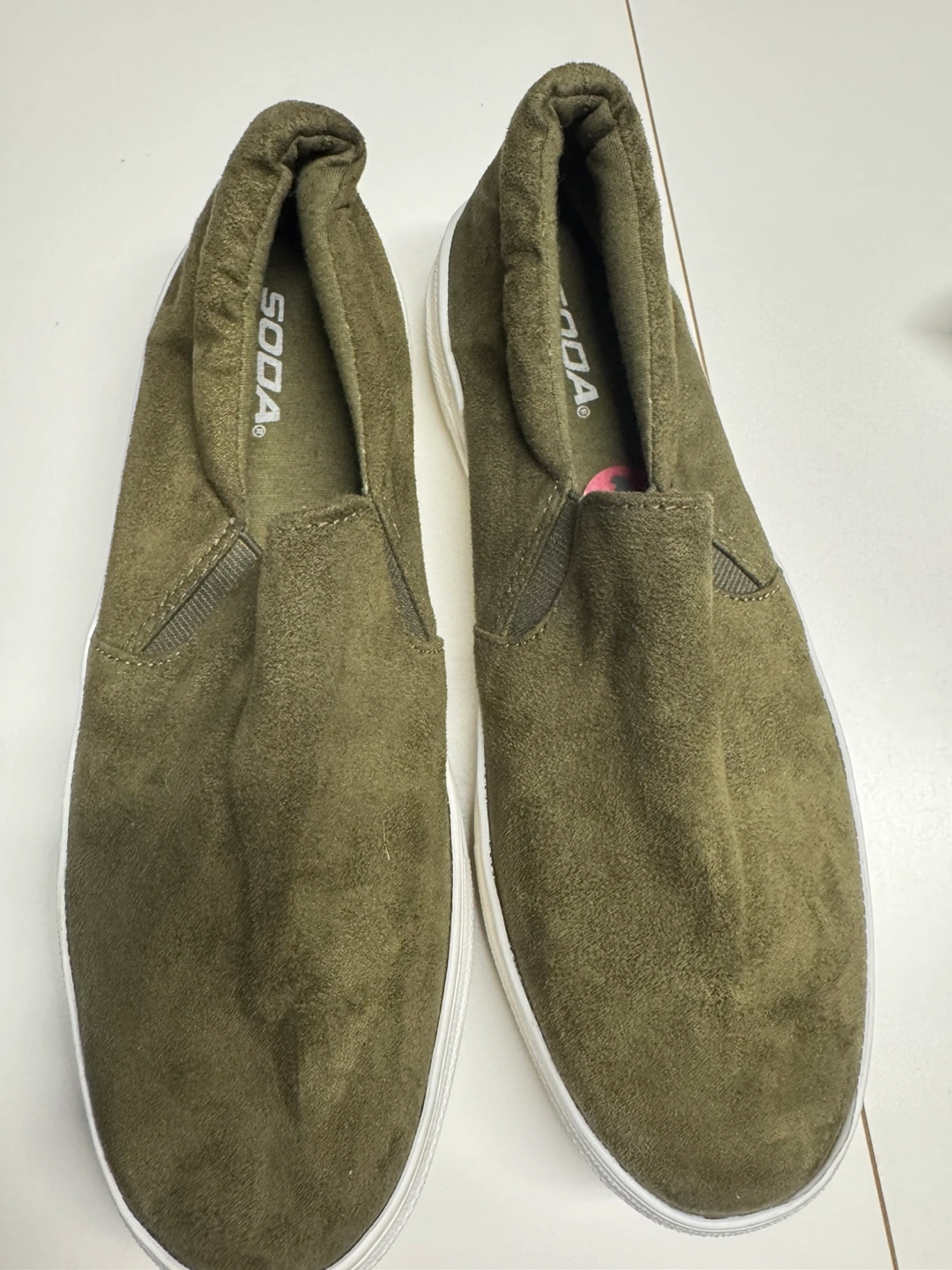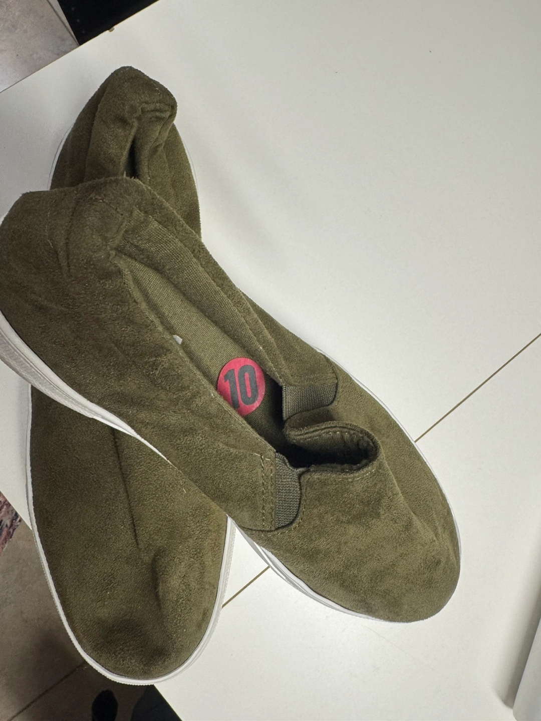 Women's slip-on sneakers. Olive green suede-like material. White rubber sole. Size 10. Comfortable casual wear.