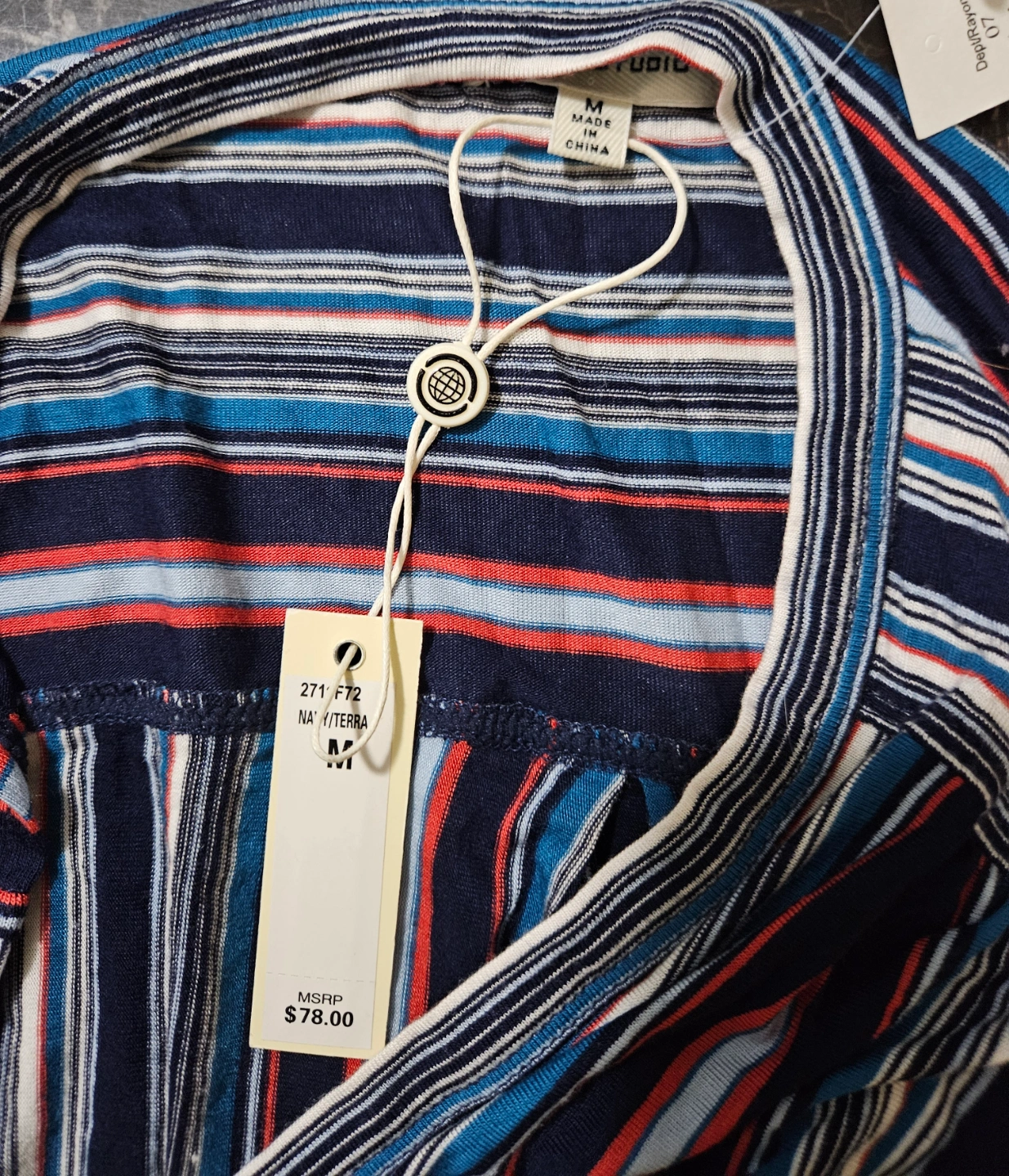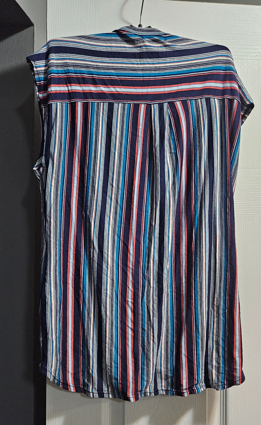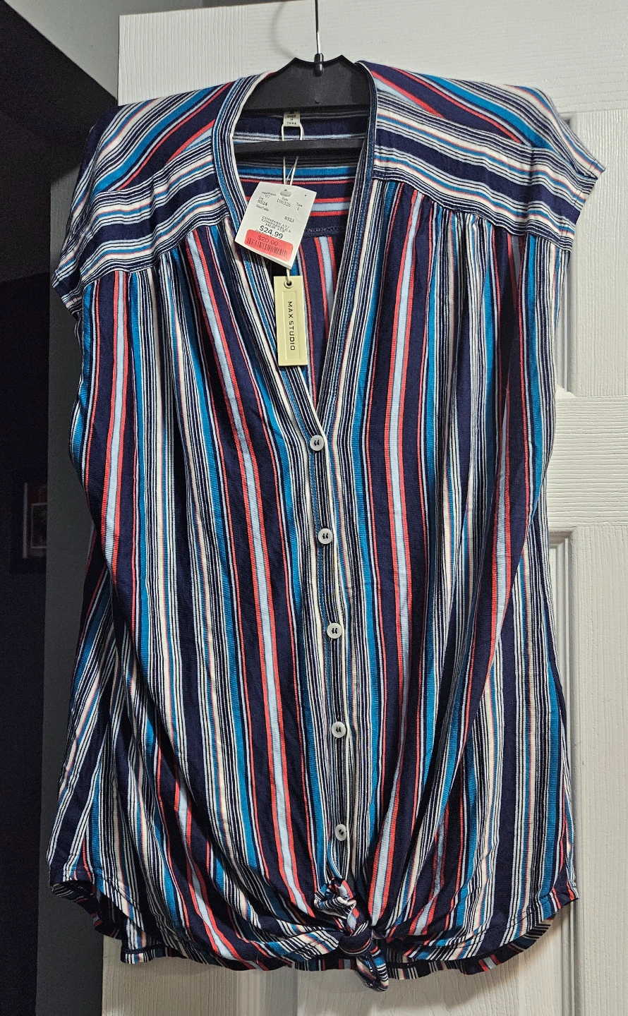 Multicoloured striped maternity top. Short sleeves. Button-down front. Knotted detail at the bottom. Size medium. Made in China.