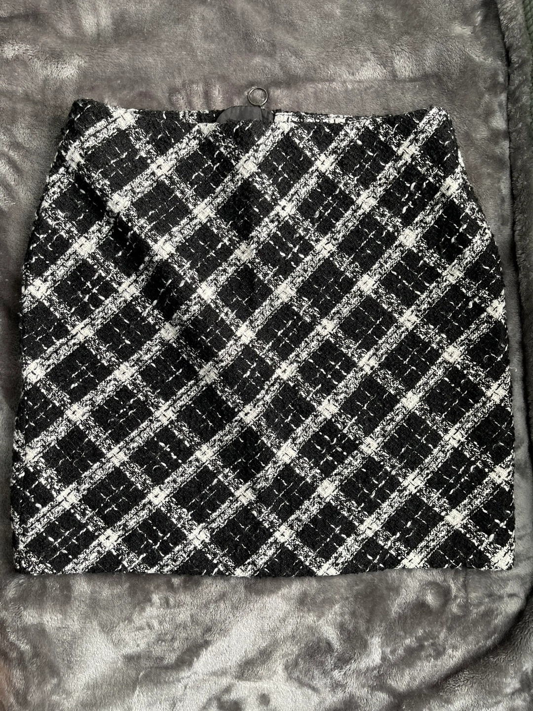 Stylish mini skirt. Black and white tweed pattern. Zip closure at the back. Good condition.