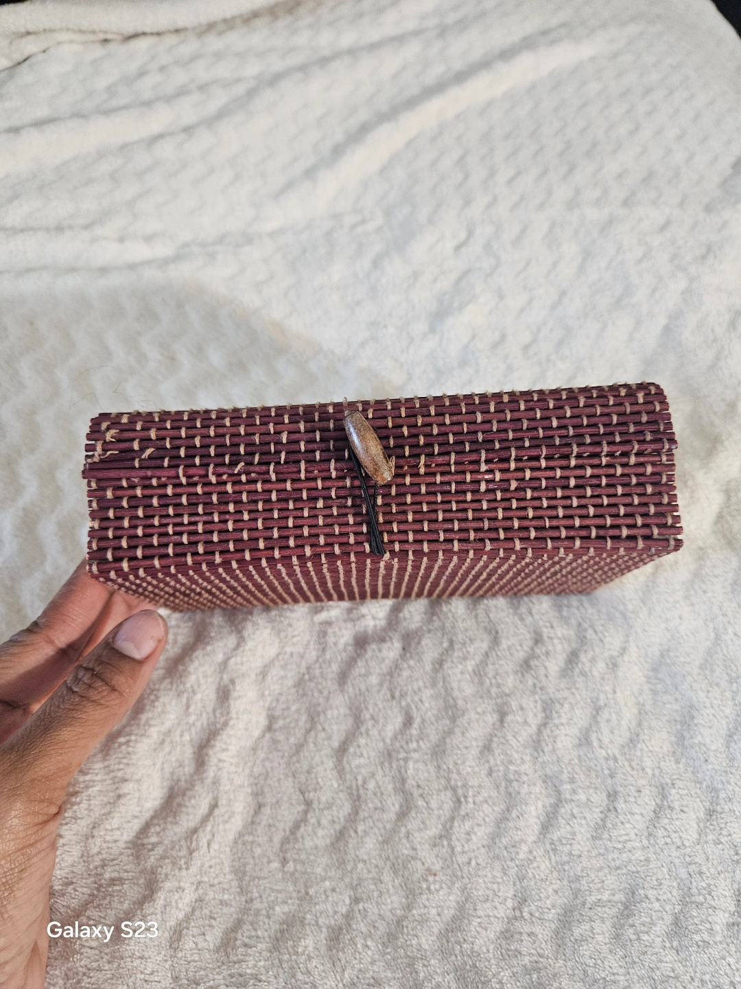 Small, rectangular box. Woven design with a dark reddish-brown and beige pattern. Wooden sides and a small wooden clasp. Perfect for small trinkets or jewellery.