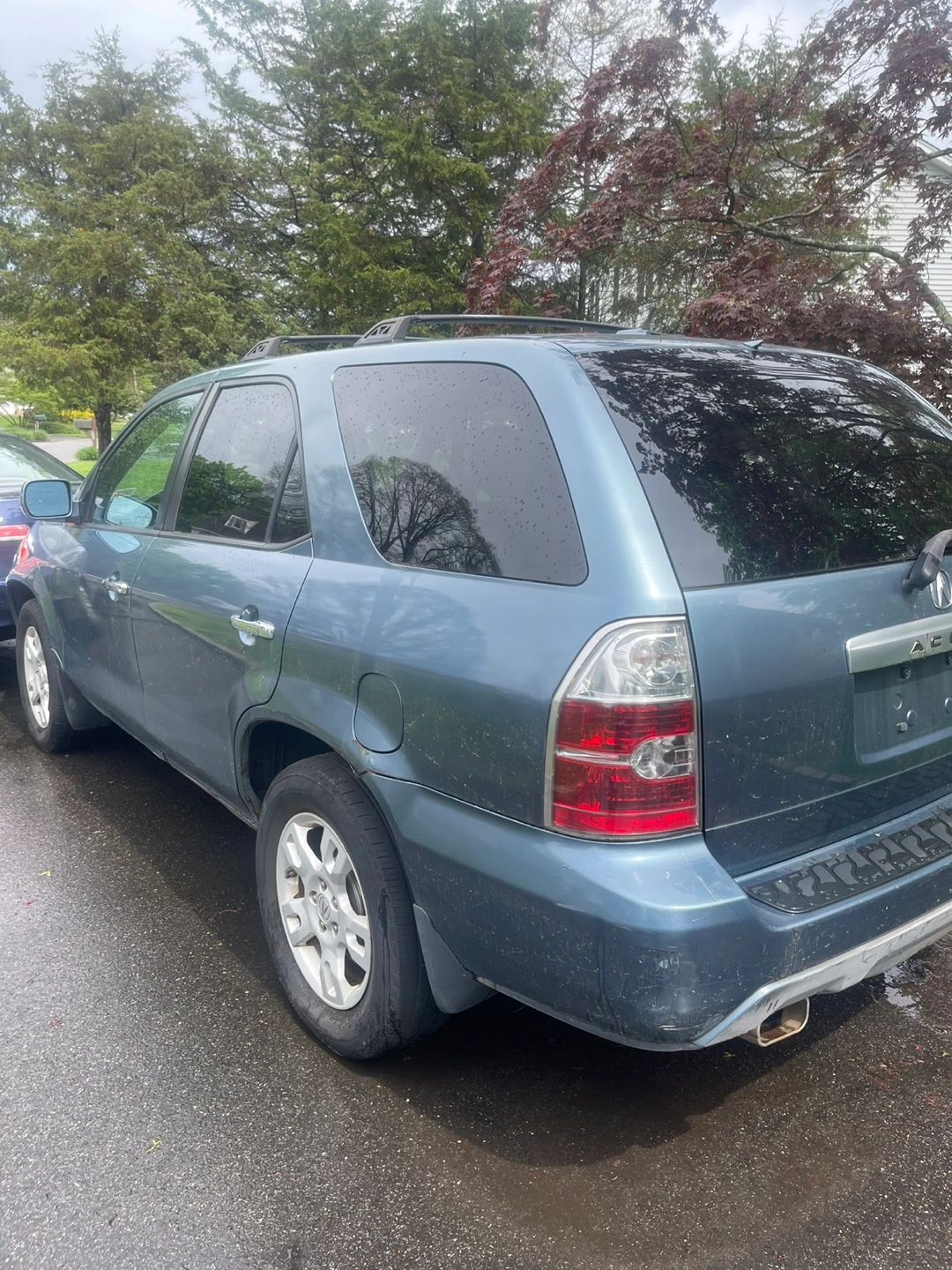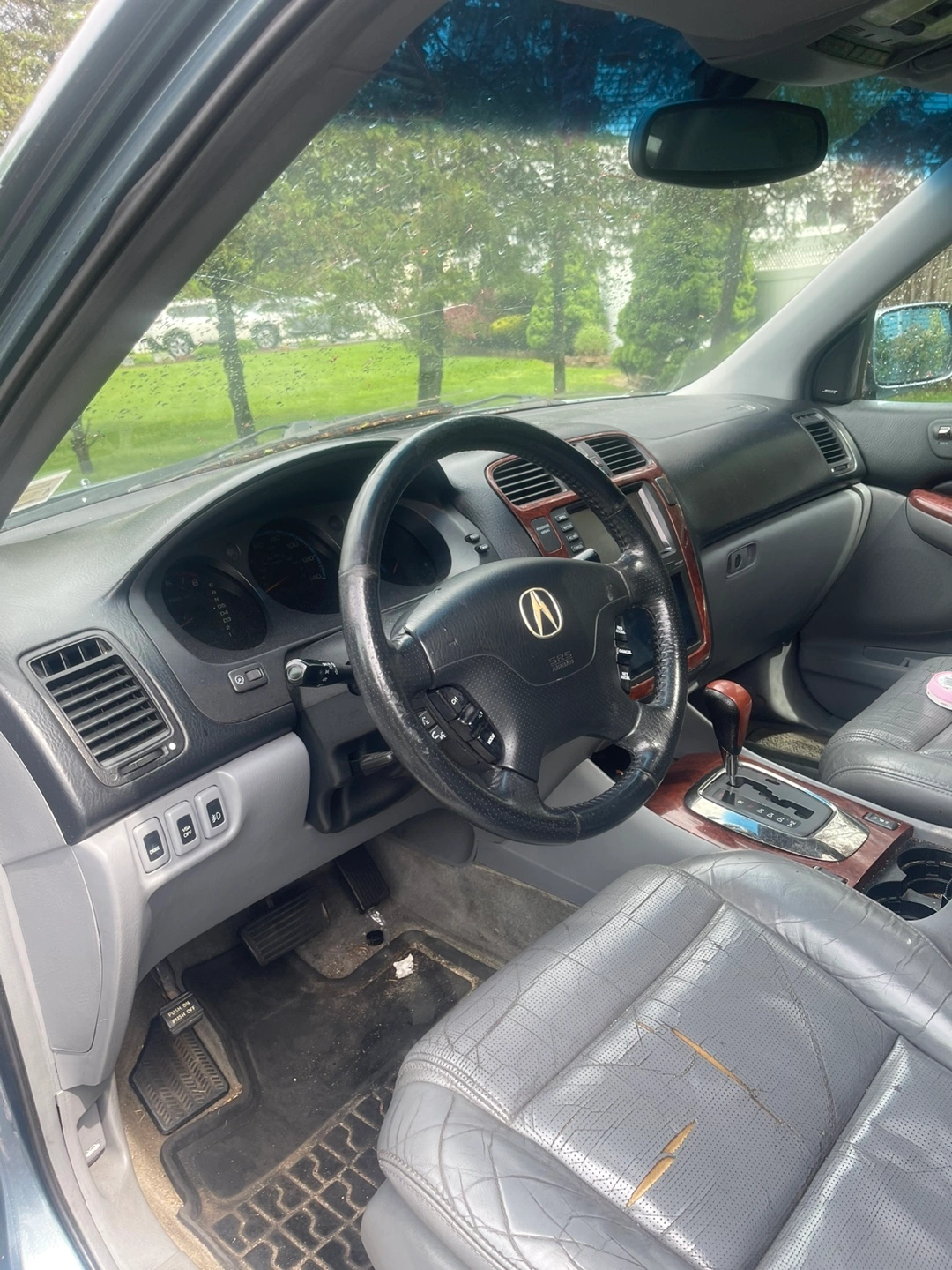 Used Acura MDX. Gray exterior. Leather interior shows wear. Needs cleaning. Roof rack. Automatic transmission. Good condition for its age.Needs knock sensor and battery