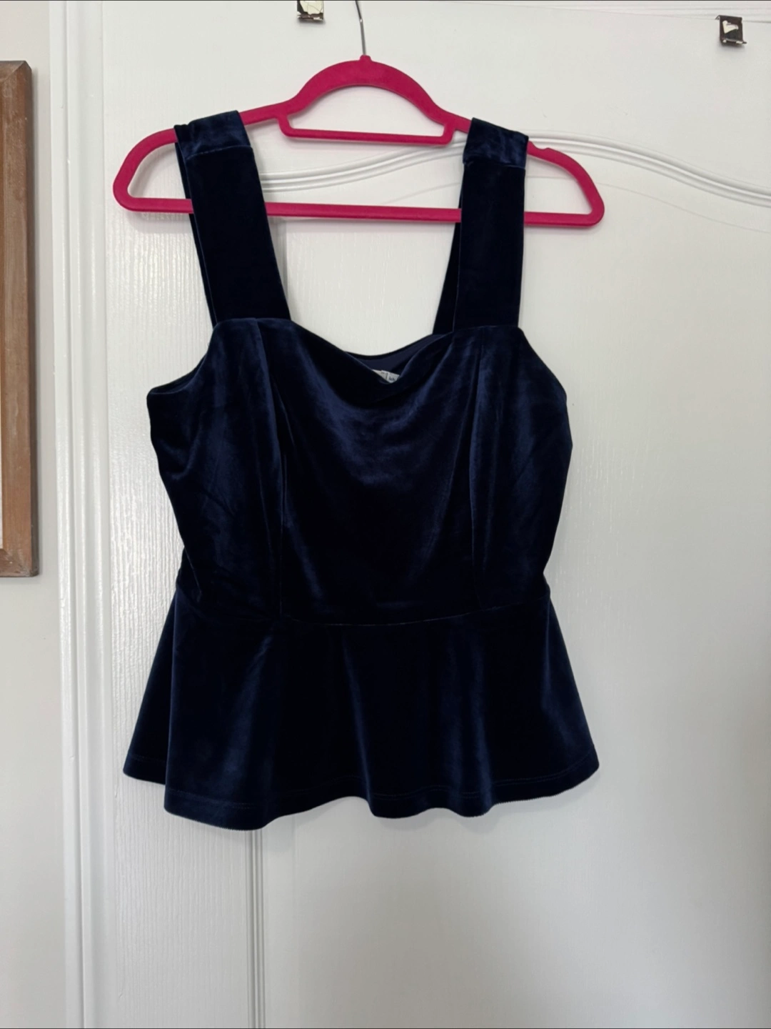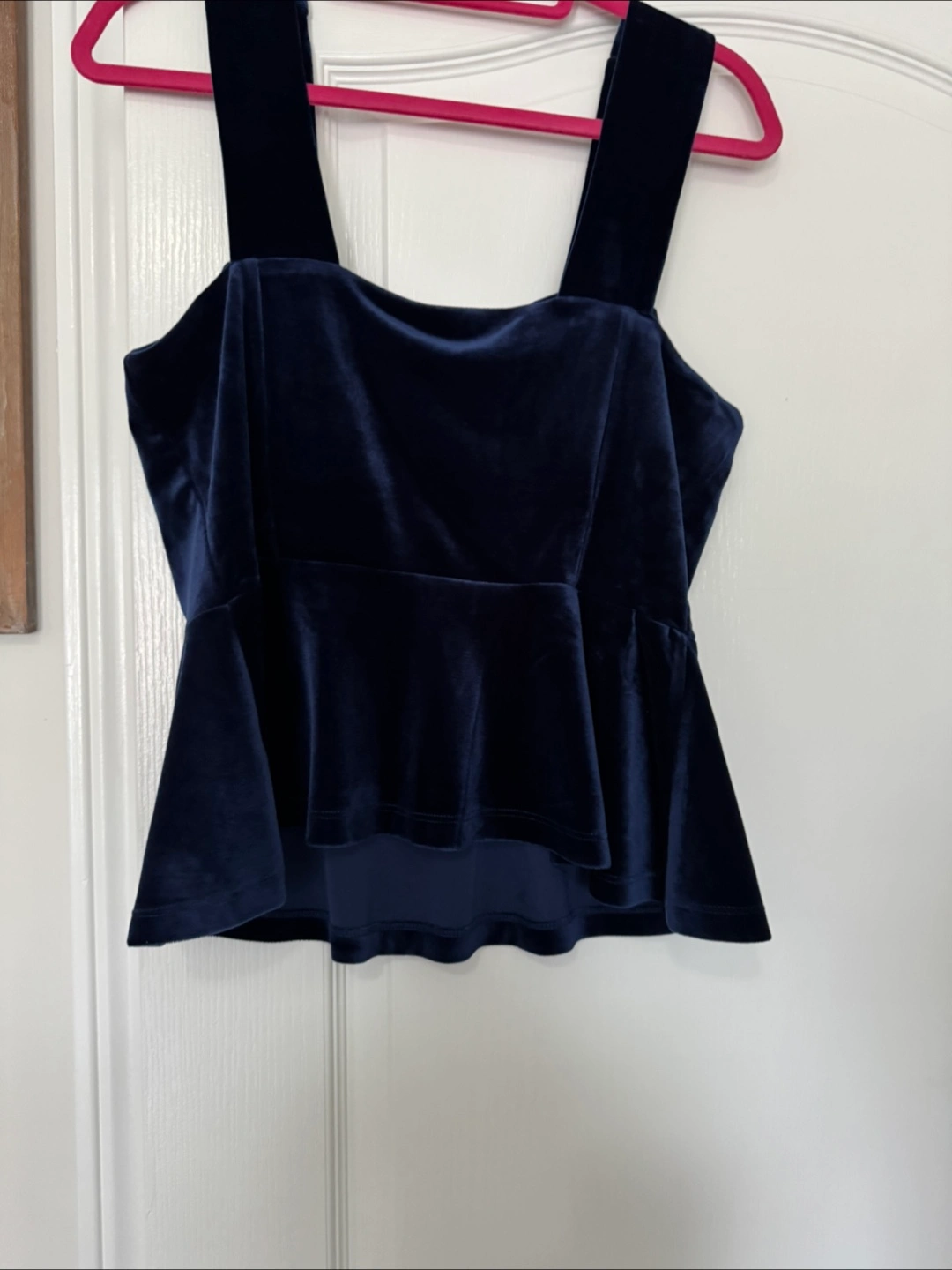 Navy blue velvet tank top. Medium size. Square neckline. Petitie fit. Adjustable straps. Slightly flared hem. New with tags.