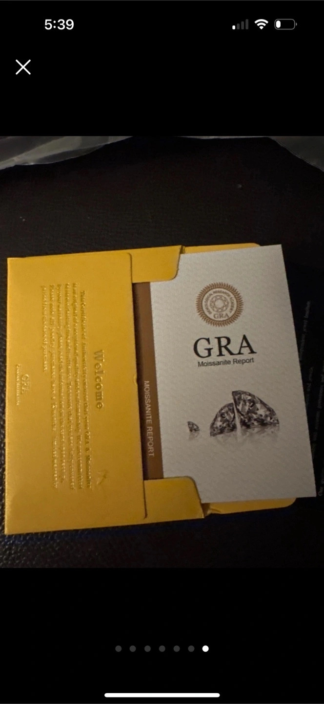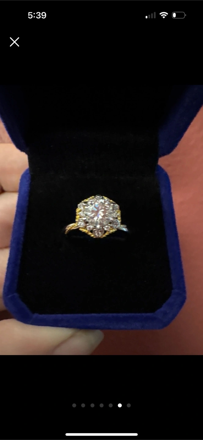 Beautiful Moissonite halo ring. Features a large center stone surrounded by smaller accent stones. 925 Gold and silver band. Comes in a blue ring box. Includes GRA certificate New