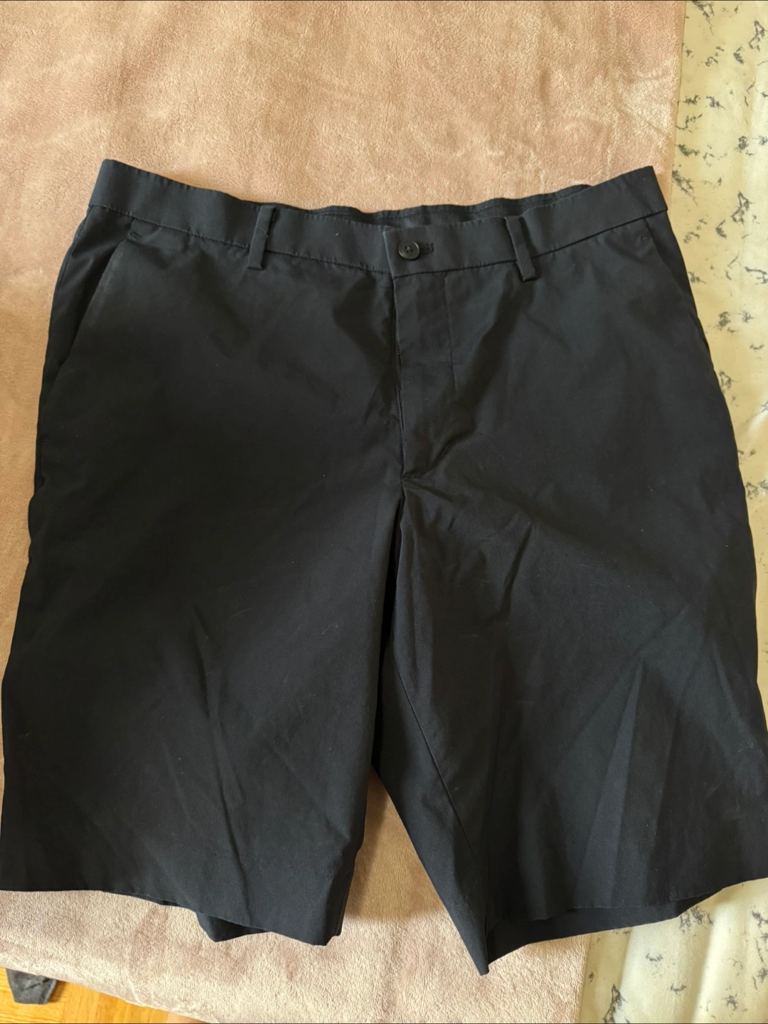 Men's black shorts. Size 32. Flat front. Two pockets. Machine washable.