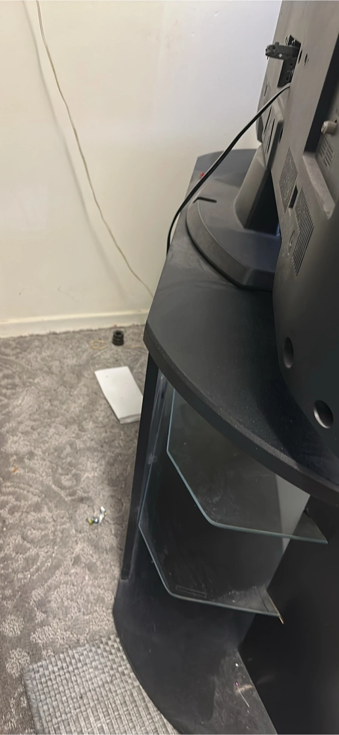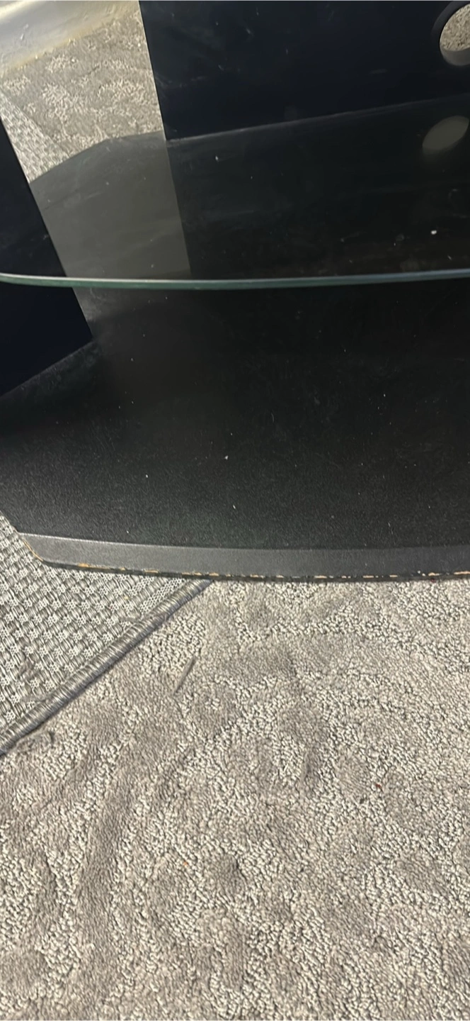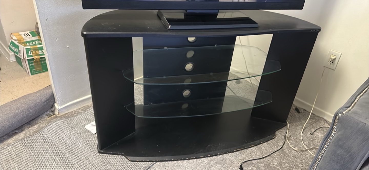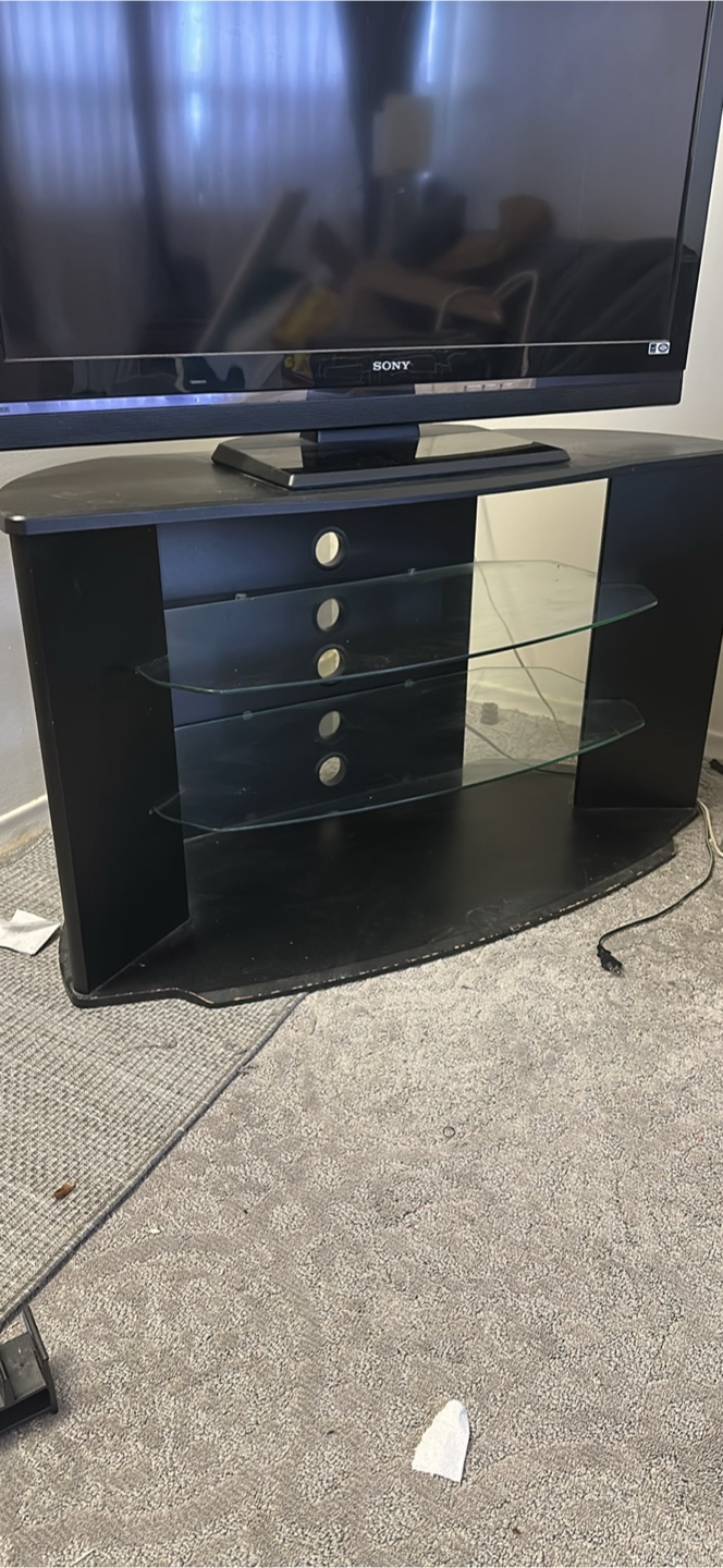 Corner TV stand. Black finish. Two glass shelves. Some minor wear.