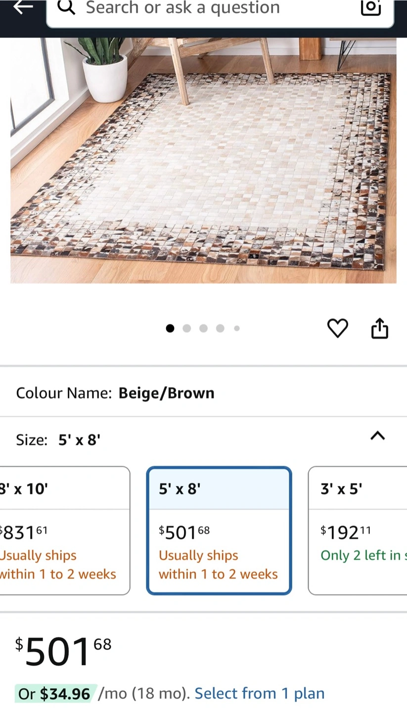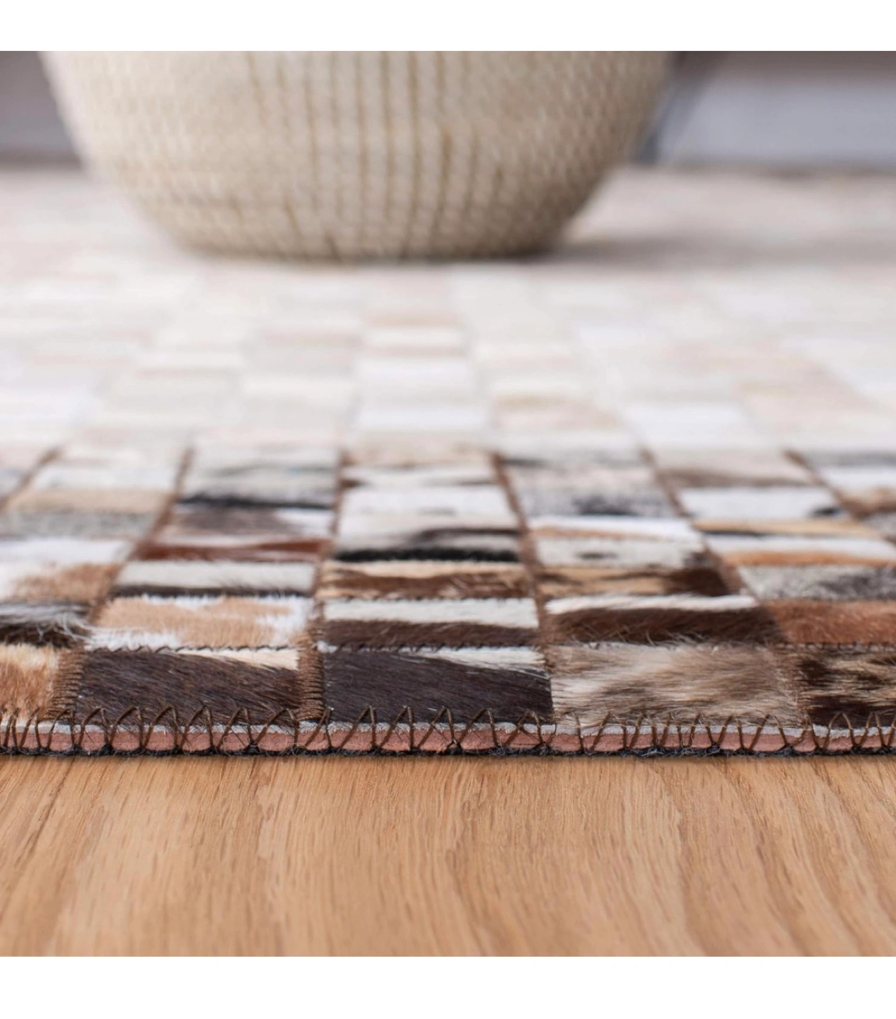 Beautiful patchwork rug. Features various shades of brown and white cowhide patches. Rectangular shape. Dark brown stitching. Soft backing.