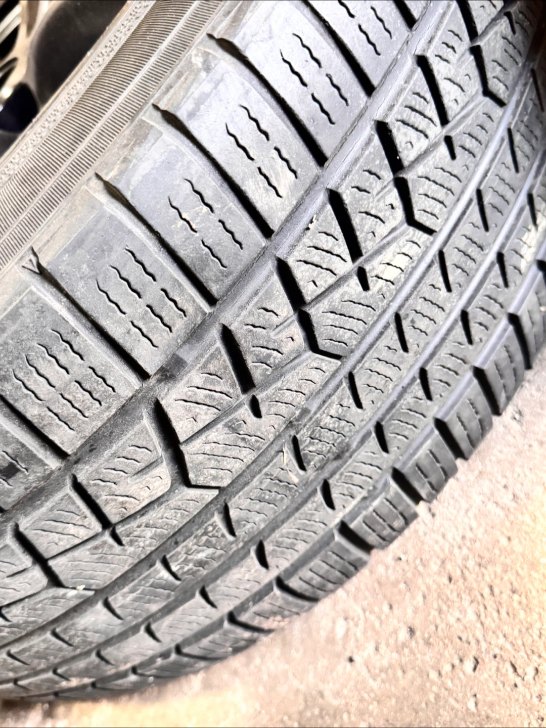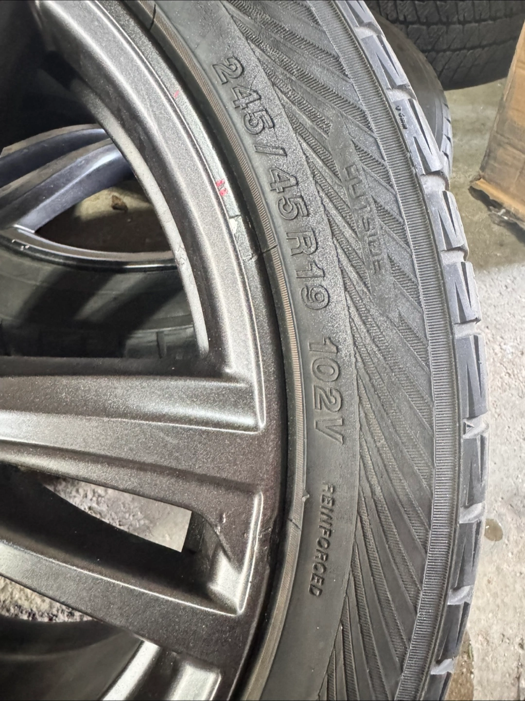Two used 4-seasons tires mounted on rims. Yokohama brand tires. Good tread depth remaining. Gunmetal grey rims. Size 245/45 R19 102V.