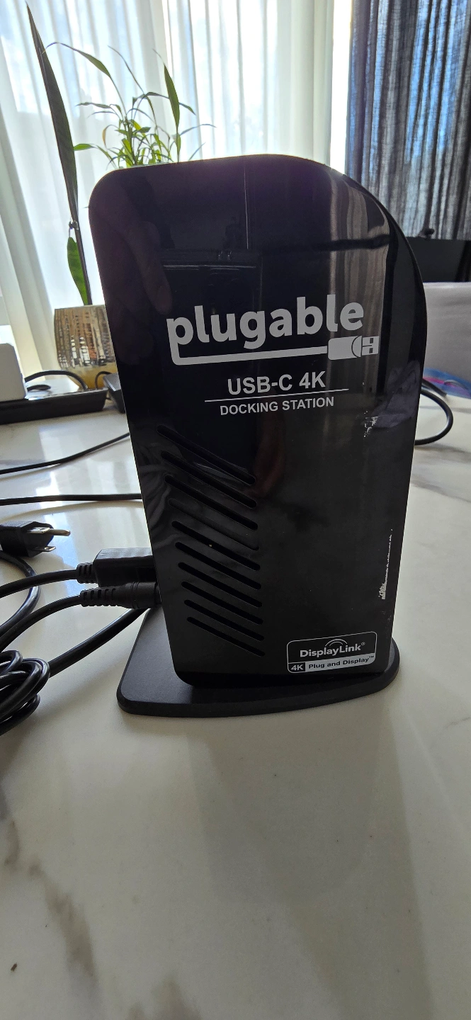 Plugable USB-C 4K docking station. Includes power adapter and ethernet cable. Supports DisplayPort and HDMI.
