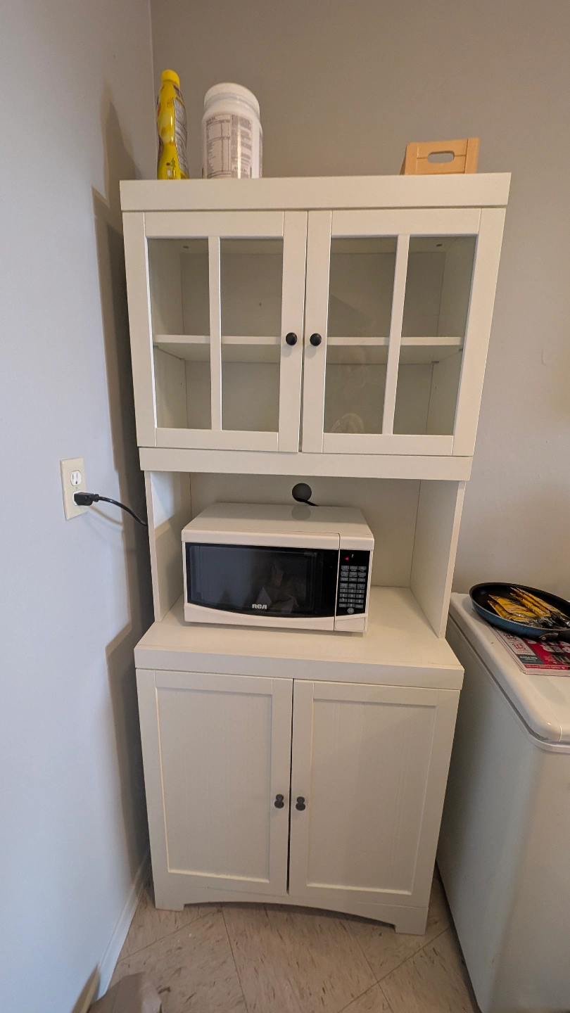 White kitchen hutch, two-tiered design. Glass-paned upper cabinets. Lower cabinets with doors. it will not be dismantled. will fit in an SUV with the seat down or pick up truck. two people needed to load. price is firm.