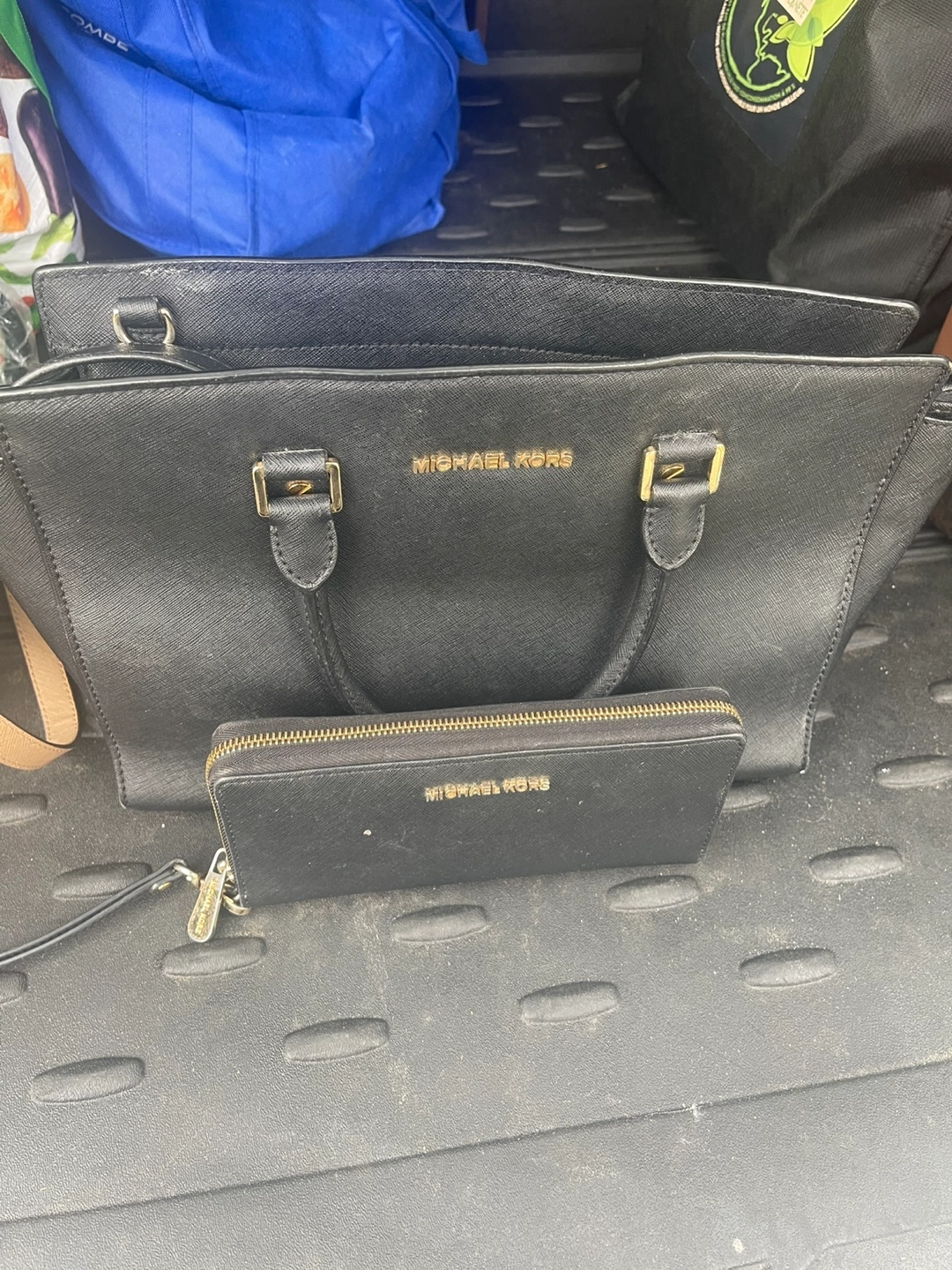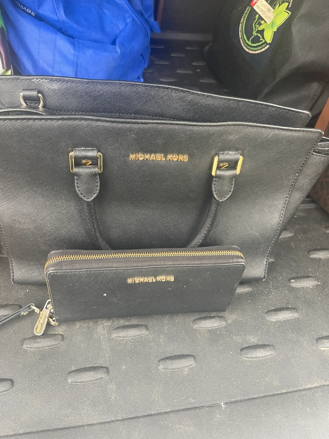 Black leather handbag and matching wallet. Gold hardware accents. Excellent for everyday use.