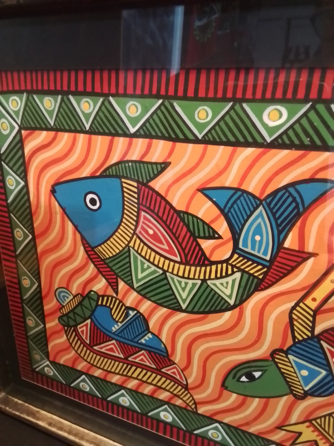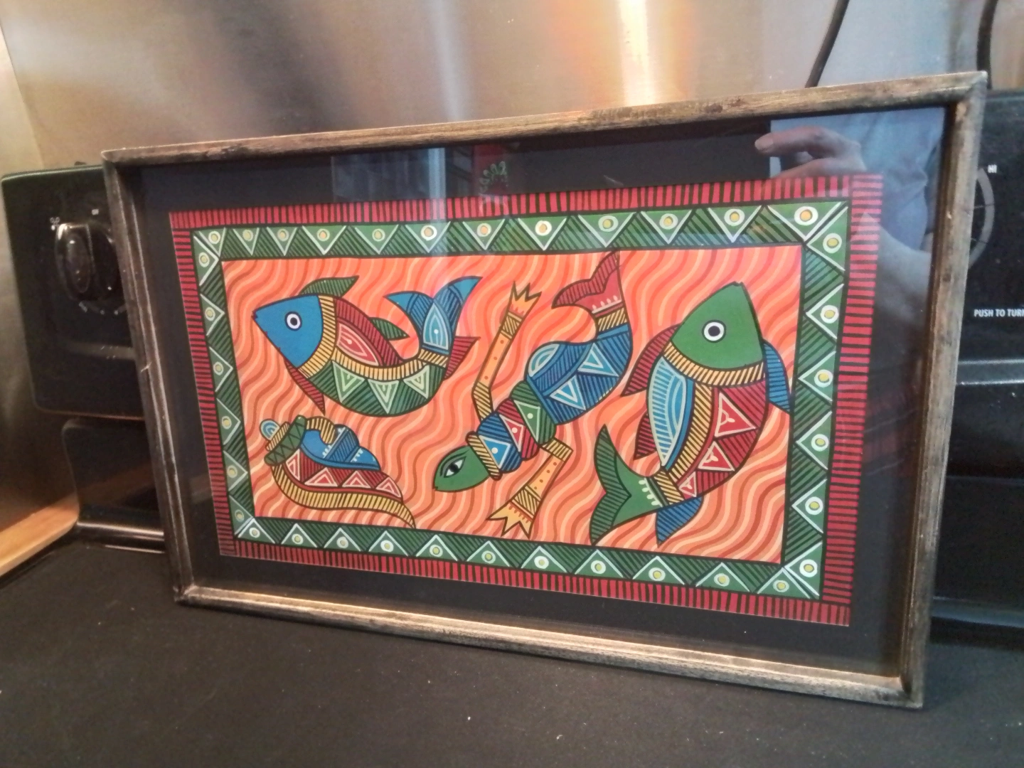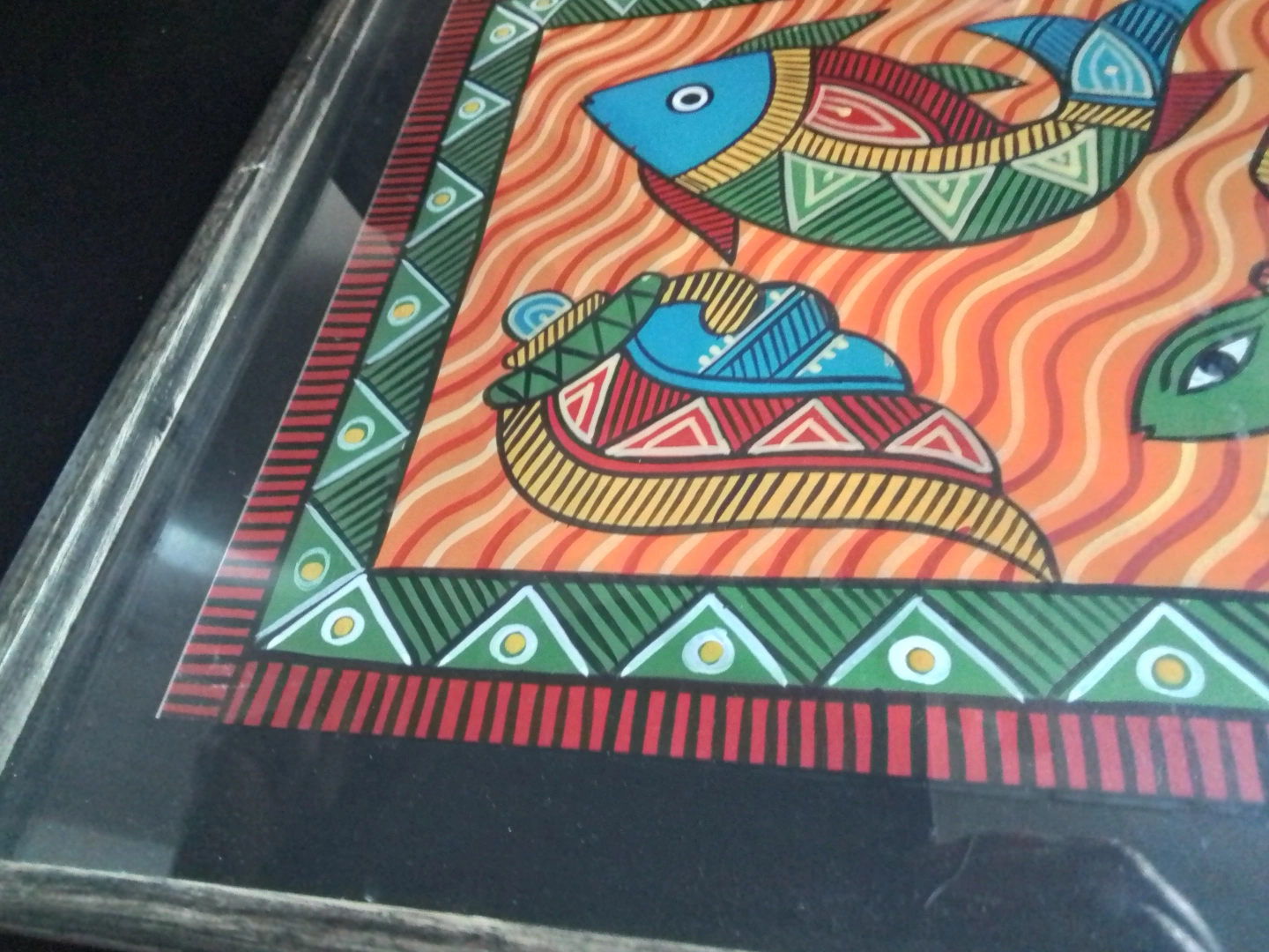 114Framed Folk Art Guashe Painting of Fish, Mermaid and Seashell Folk Art Guashe Painting This striking folk art gouache painting features a vibrant composition of fish and traditional motifs, all encased in a simple frame. The painting is in good used condition, bringing a touch of cultural artistry to any room. A unique piece that catches the eye and sparks conversation! * **Style**: Folk Art * **Medium**: Gouache * **Subject**: Fish * **Framed**: Yes Measurements: 17x11 If you're wondering if this ad is still up, rest assured, it is! Like a well-kept secret, this painting is waiting for the right admirer. Don't let it swim away! Vibrant hand-painted artwork featuring colourful fish and turtles. Set in a simple wooden frame with glass. A unique piece of folk art. Pickup at Young Street and Steels Ave