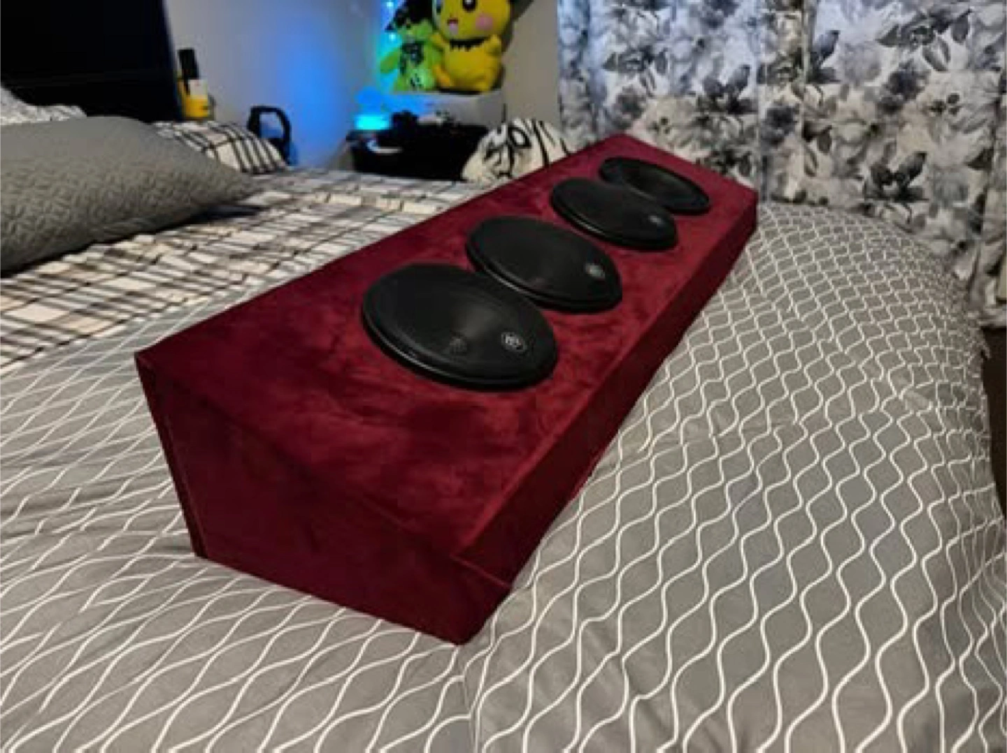 Red velvet-covered speaker enclosure. Four speakers installed. Approximately 42 inches long. Excellent for car audio was built for show car but decided to go a different set up