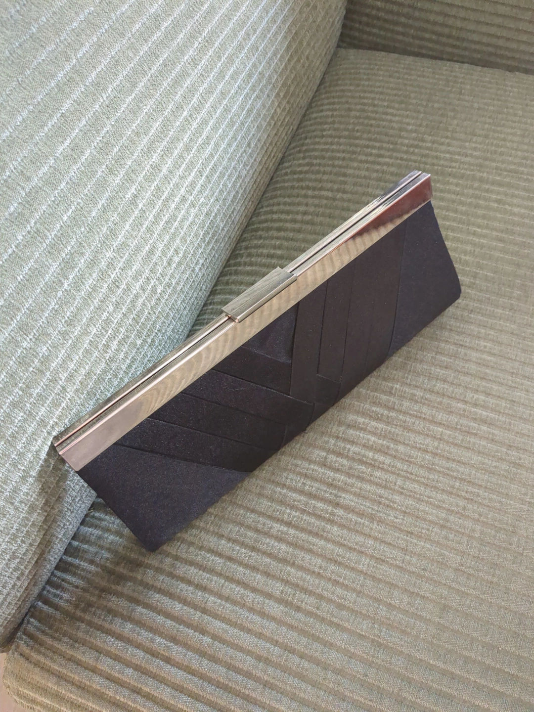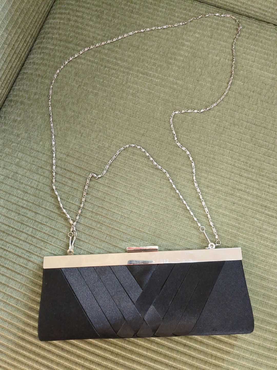 Elegant black satin clutch. Features a silver-toned clasp and two detachable chain straps. Perfect for evenings out.