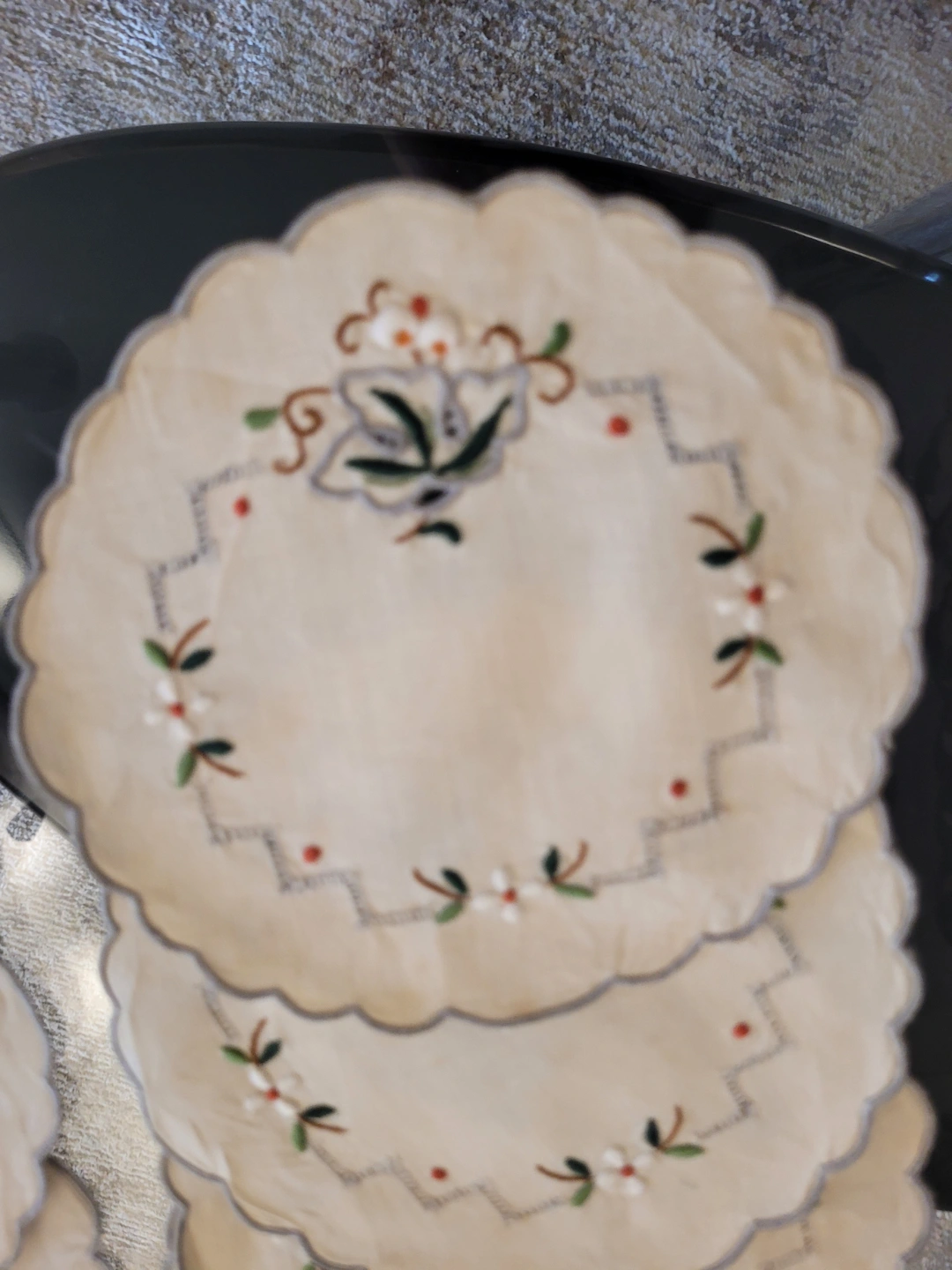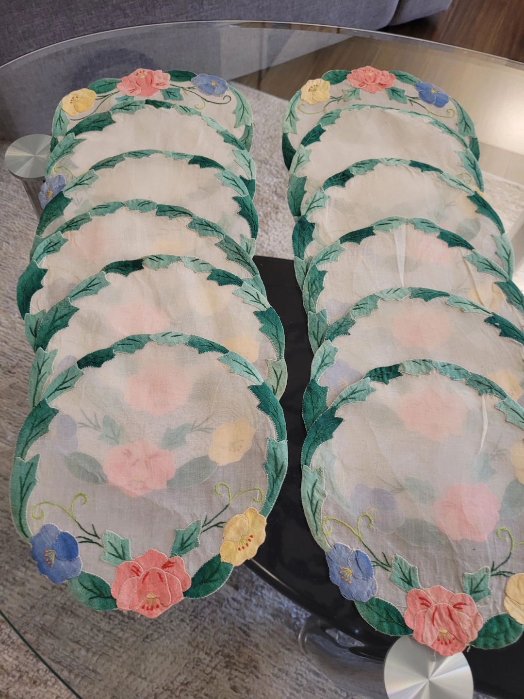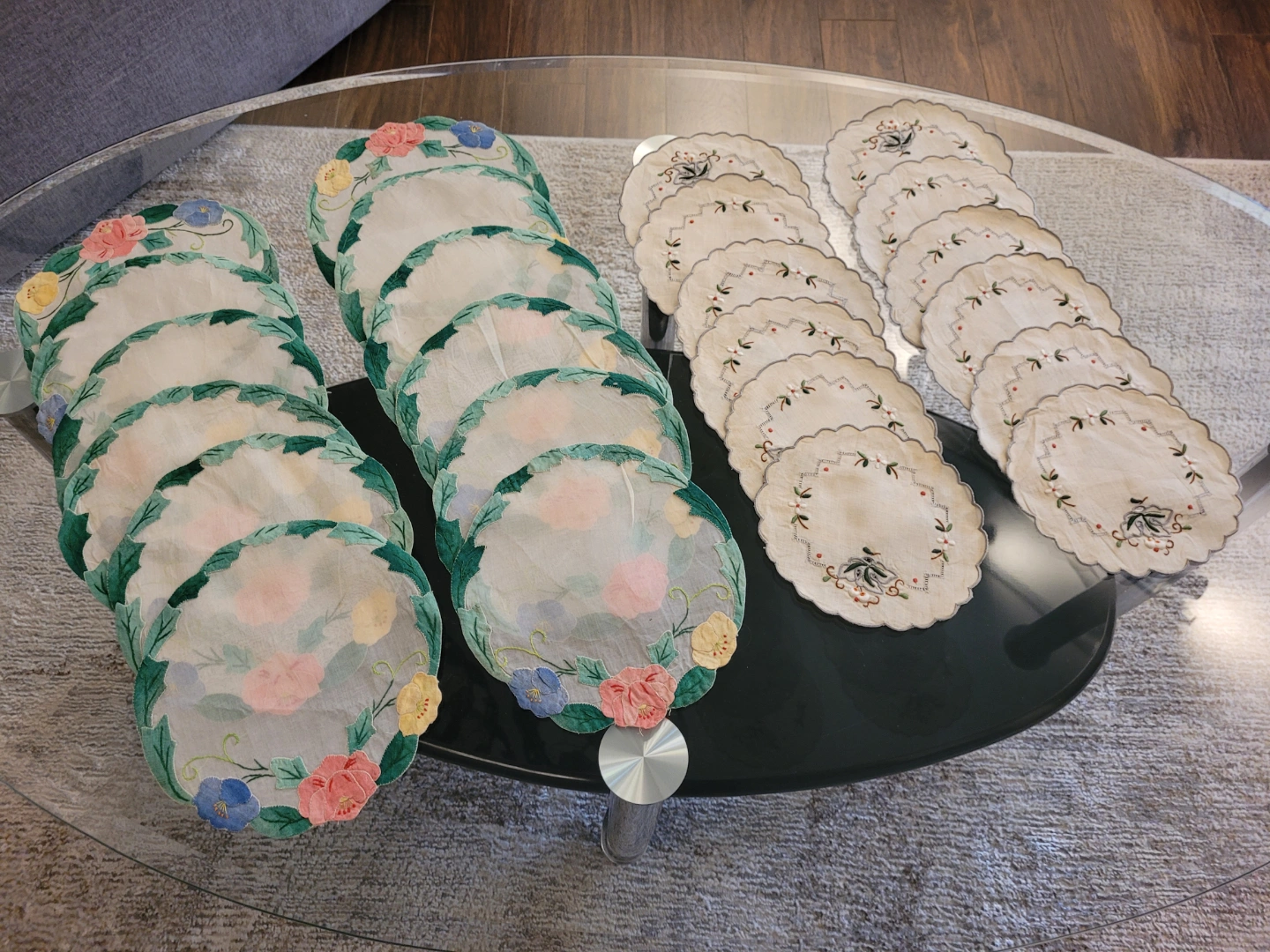 Two Sets ( 12pcs each)vintage embroidered coasters. Two different floral designs. Beautiful colours and detailing. Perfect for adding a touch of vintage charm to your table.