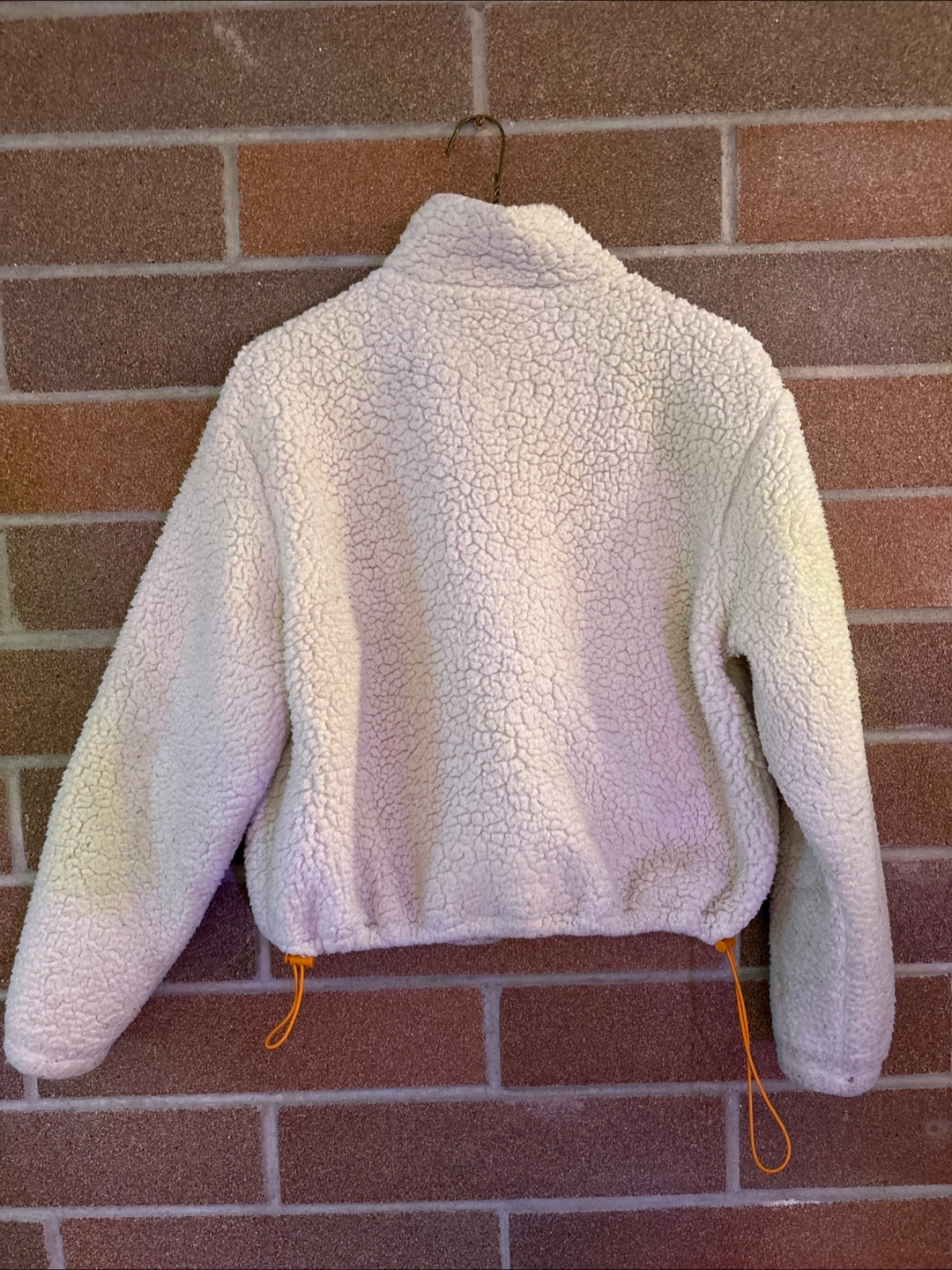 White/ Cream-coloured fleece jacket. Size small. Half zip. Drawstring bottom. Orange drawstrings. Pockets. Used. Fair condition.