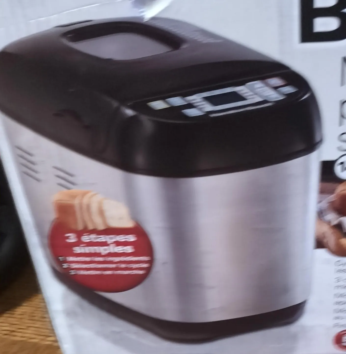 Automatic bread maker. Stainless steel design. Features a digital display and control panel. Makes bread in three simple steps.