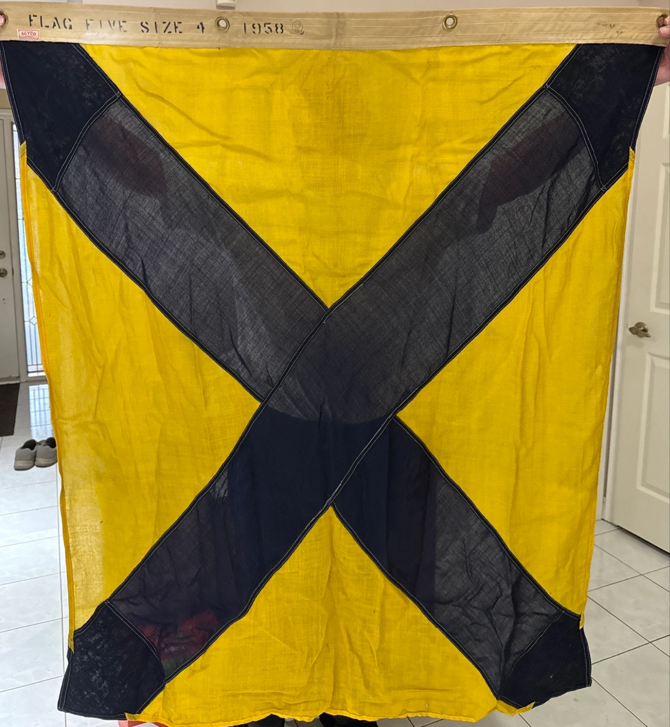 Vintage flag, yellow with blue X (number ‘5’).