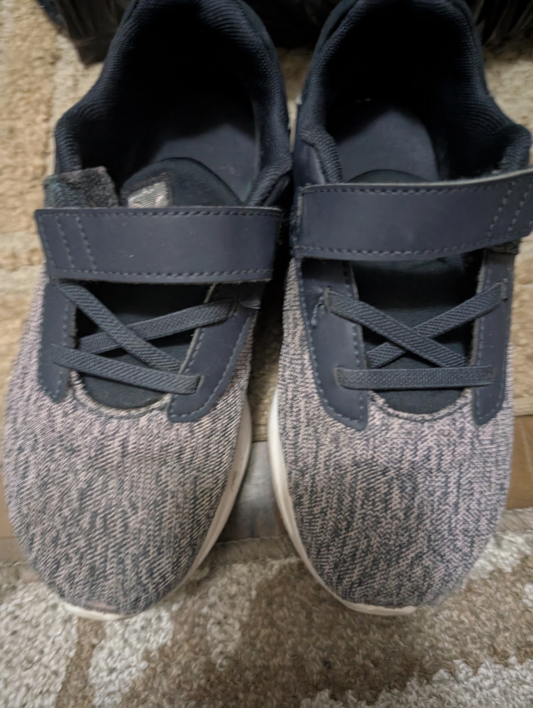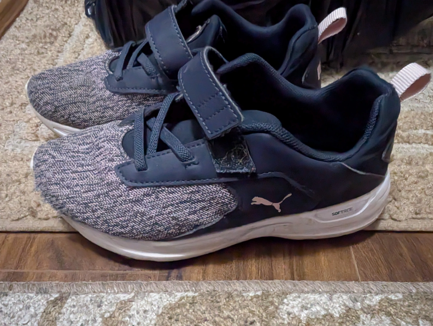 Lightly used Puma running shoes. Grey and navy colour scheme. Velcro strap closure. Softfoam cushioning. Great for active kids.