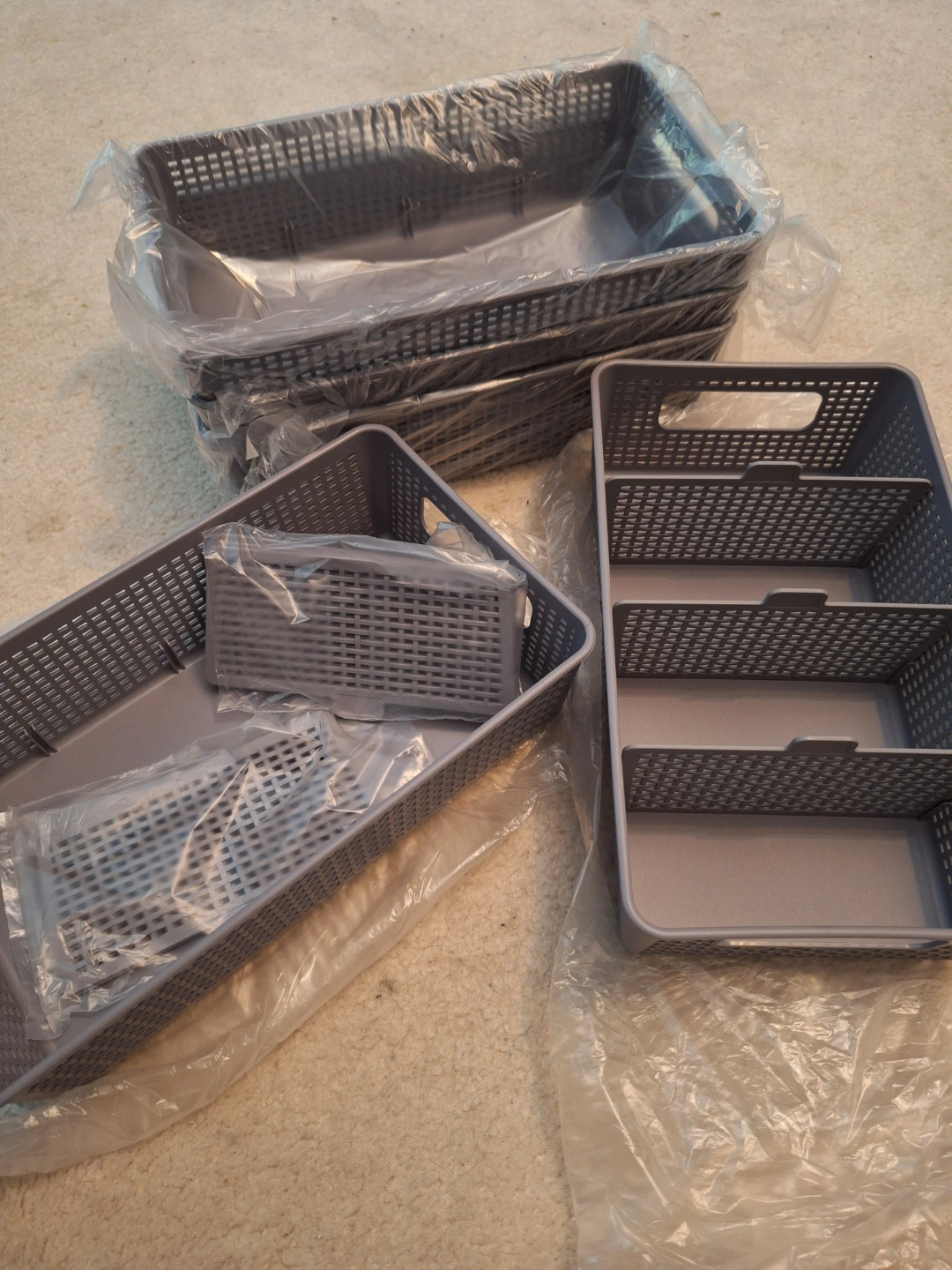 Set of grey plastic storage bins. Total of 5 bins with 3 dividers each. Ideal for organizing drawers or shelves. Durable and lightweight plastic.