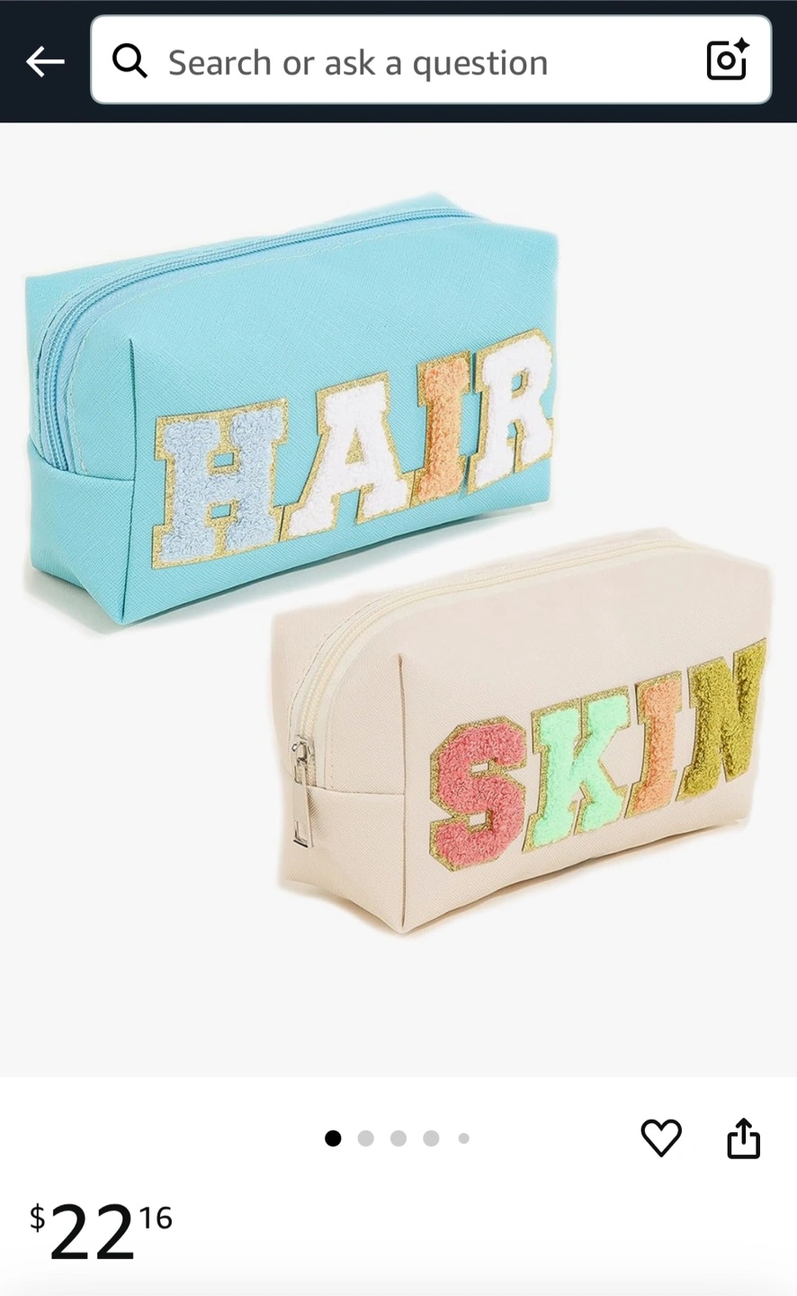 Two zippered pouches. One light blue with the word HAIR. One off-white with the word SKIN. Both feature colourful, fuzzy lettering. Perfect for travel or organizing toiletries.