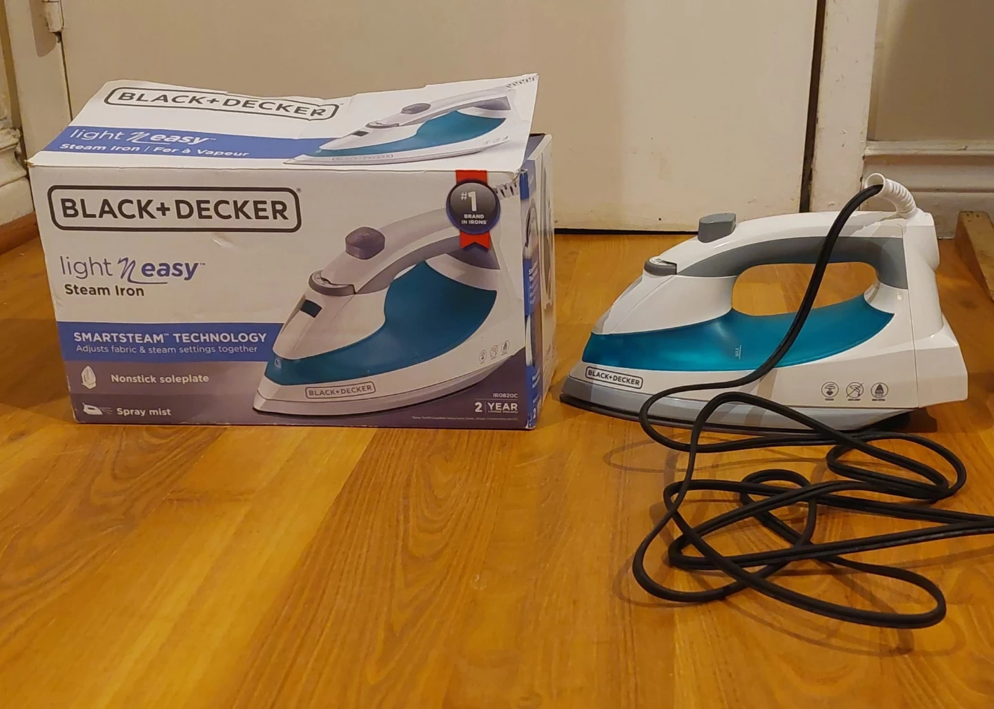 Black+Decker Light 'n Easy steam iron. New in box. Features SmartSteam technology. Non-stick soleplate. Adjustable fabric and steam settings. Includes spray mist function.