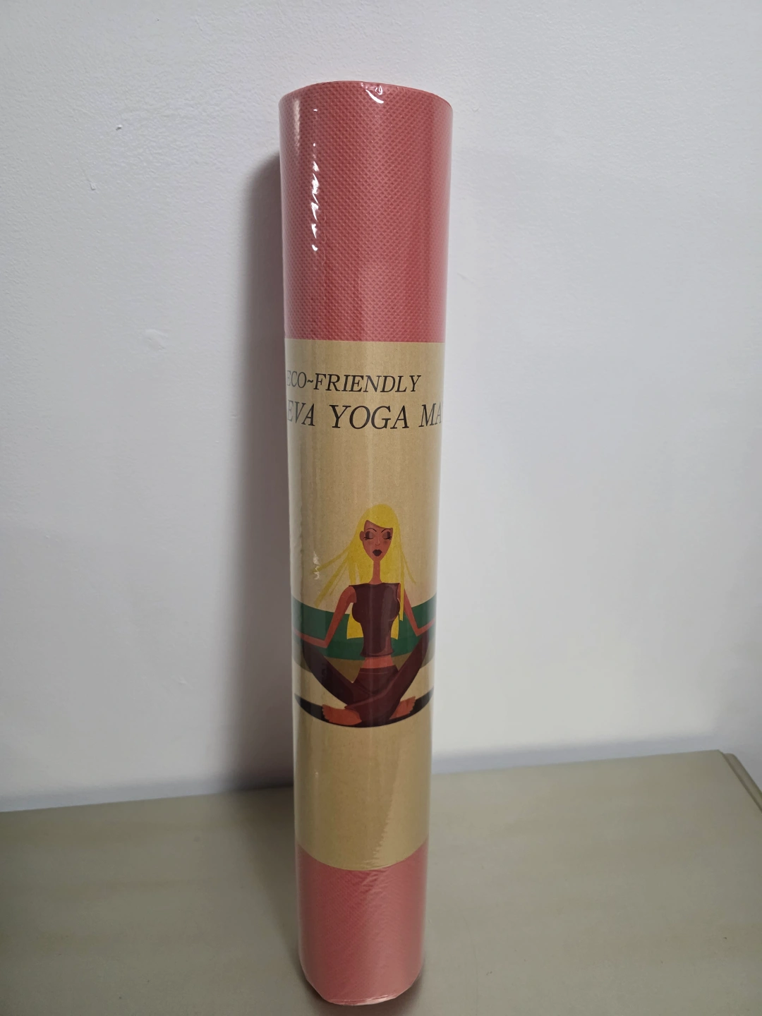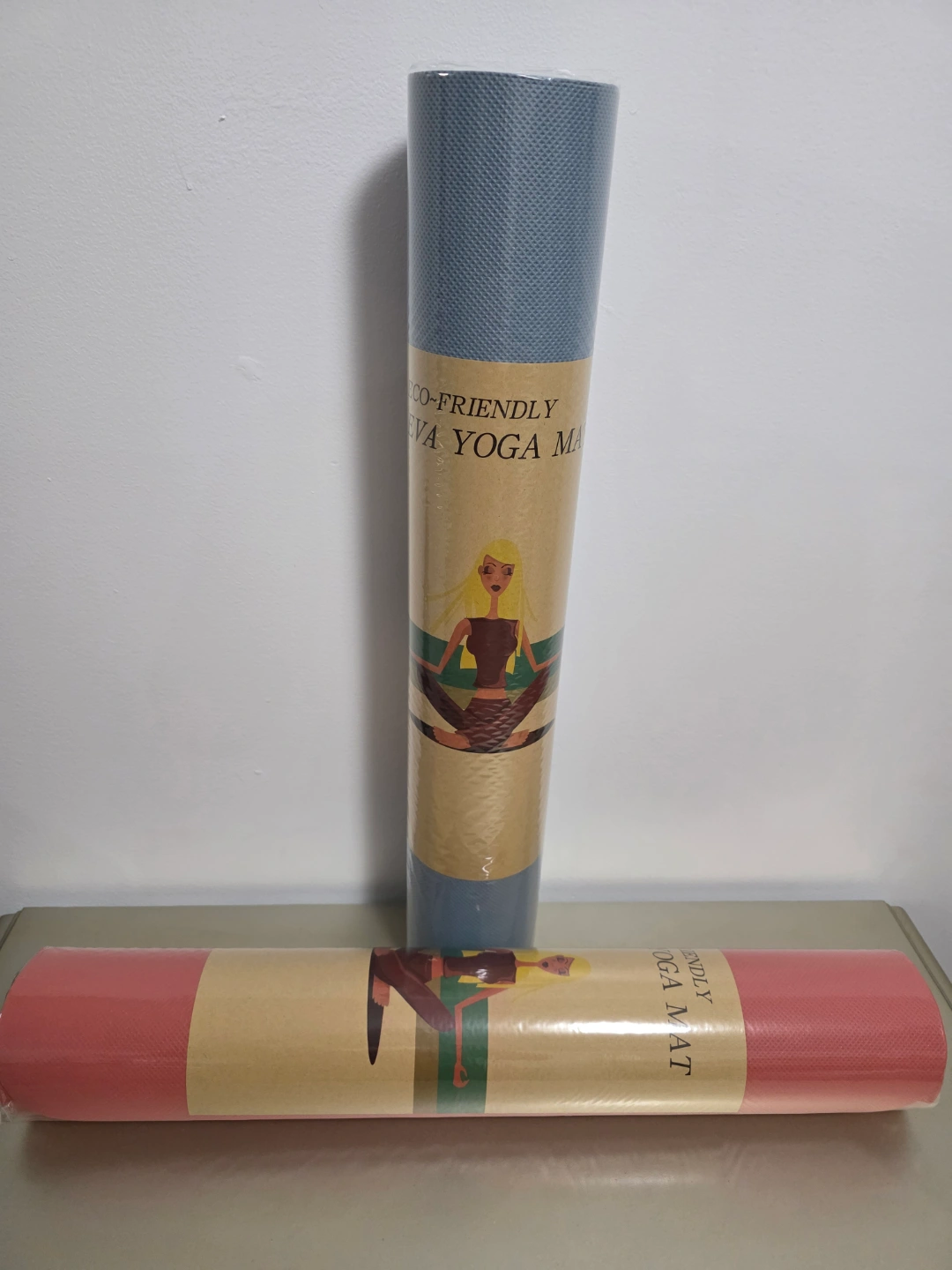 Eco-friendly EVA yoga mats. 2 colors to choose from pink or blue. Rolled and ready for use. Great for yoga, pilates, or stretching.