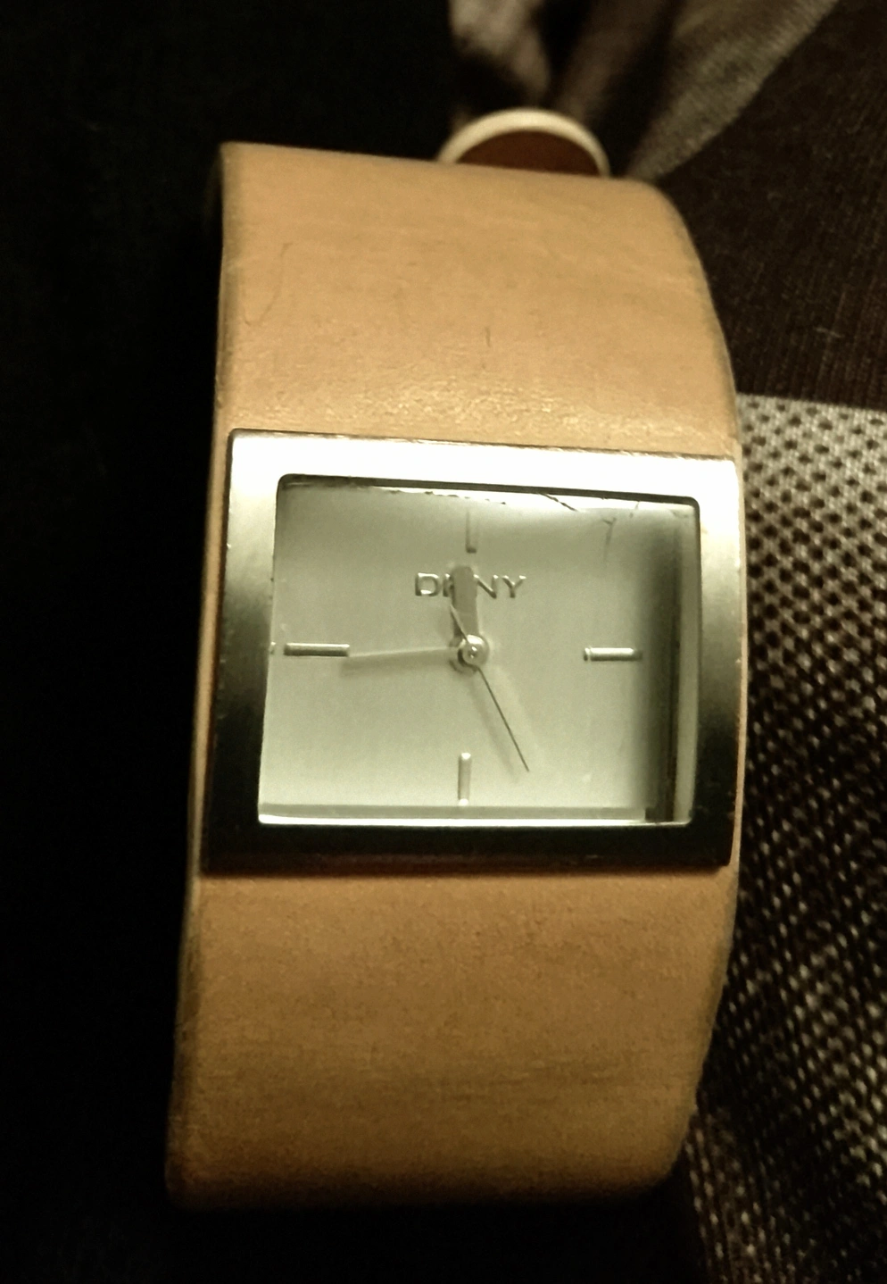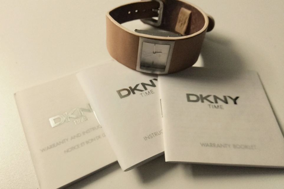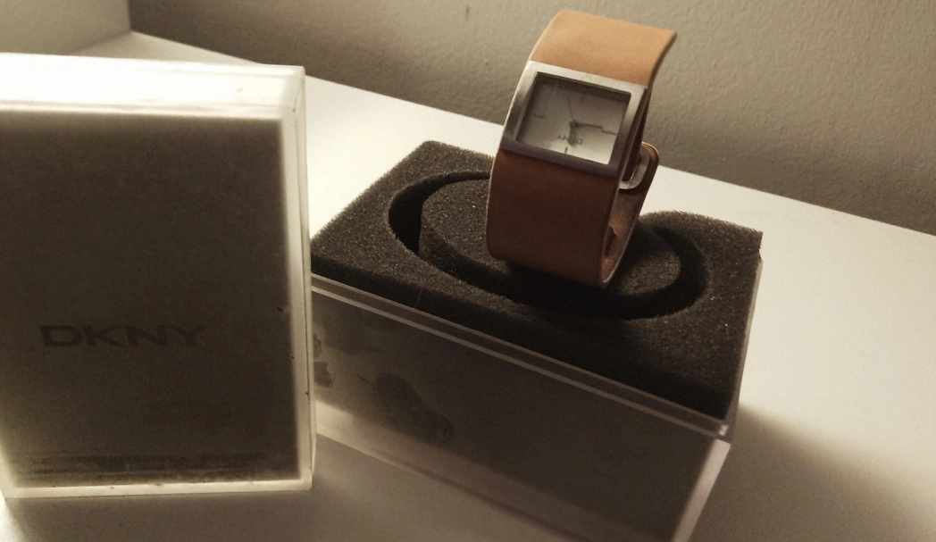 273DKNY Women's watch. Tan leather band with some minor wear. Square opal face. Silver coloured accents. Comes with original box and paperwork.