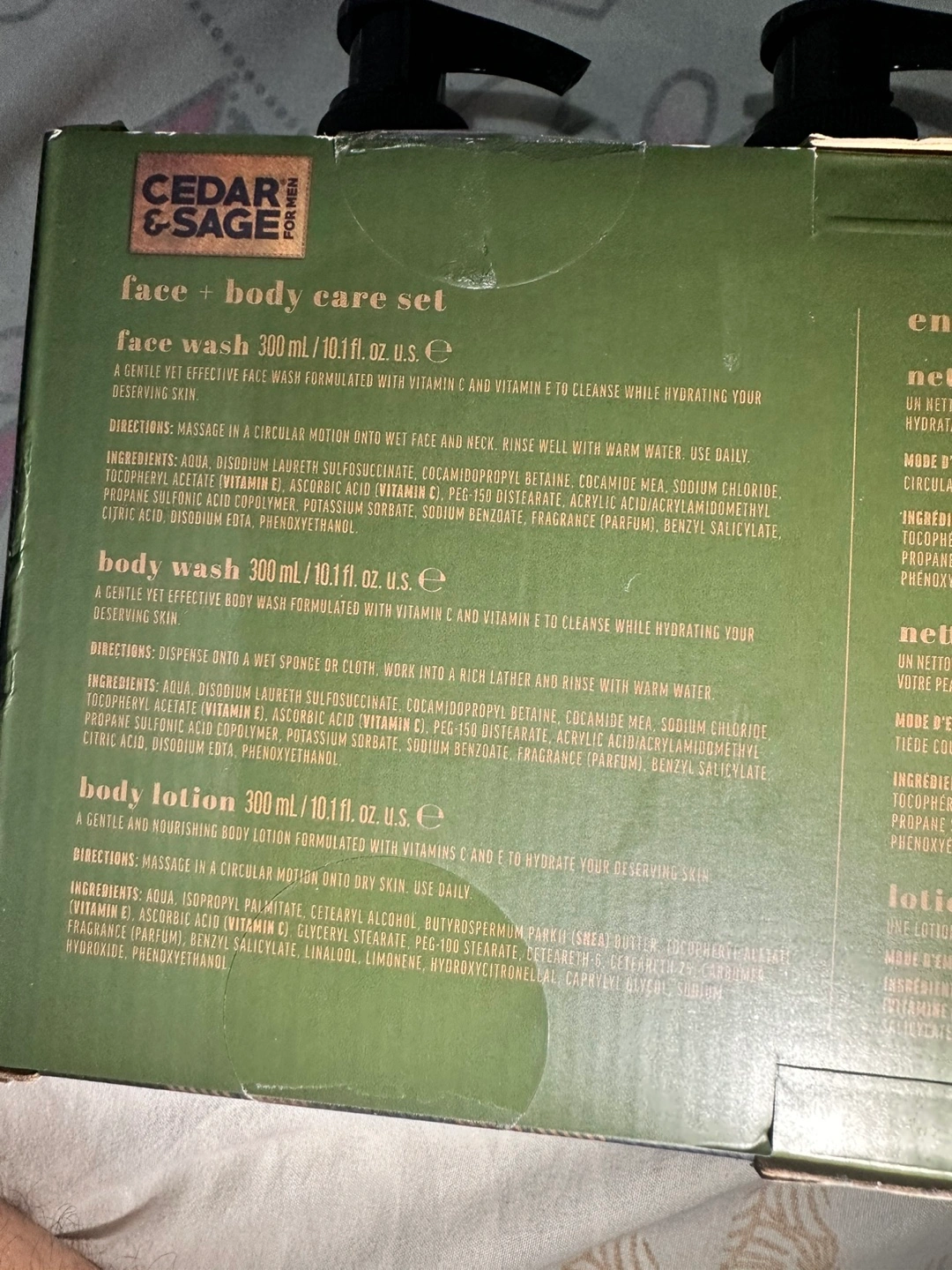 New, unopened Cedar & Sage face and body care set. Includes face wash, body lotion, and body wash. 3 x 300ml/10.1 fl oz. Perfect gift!