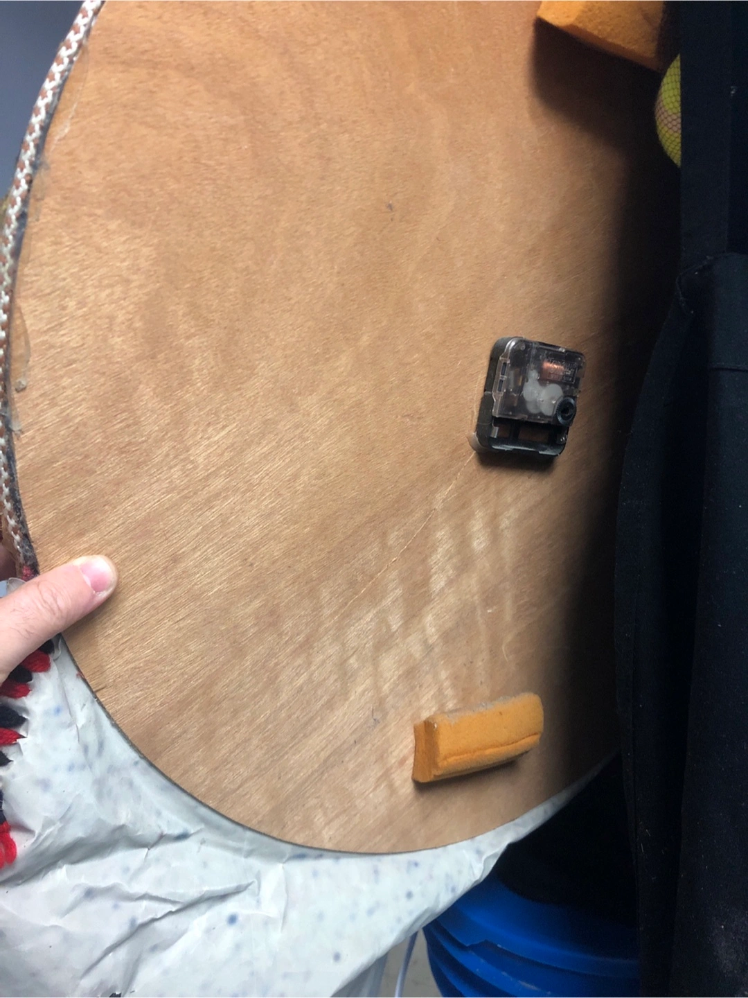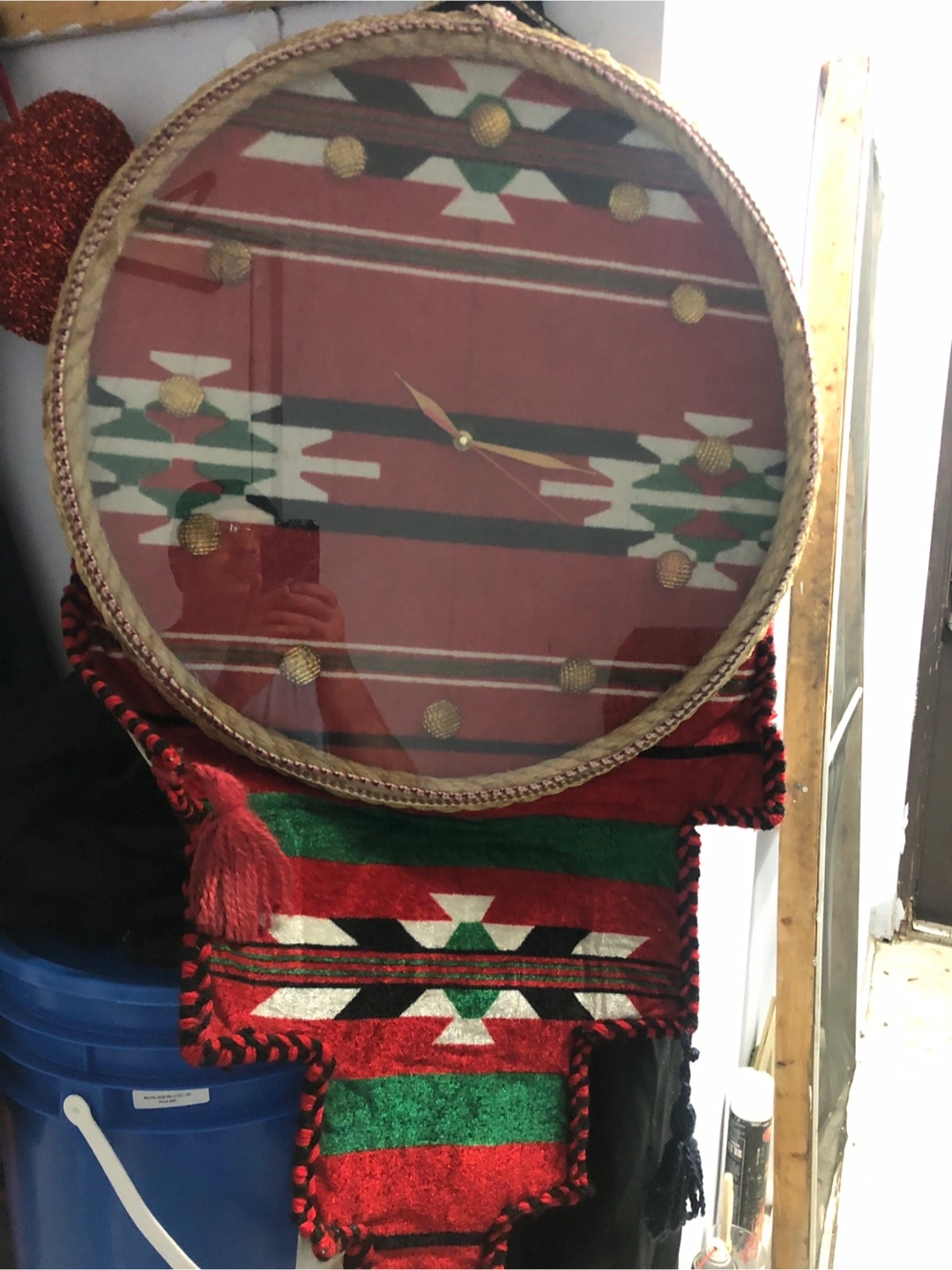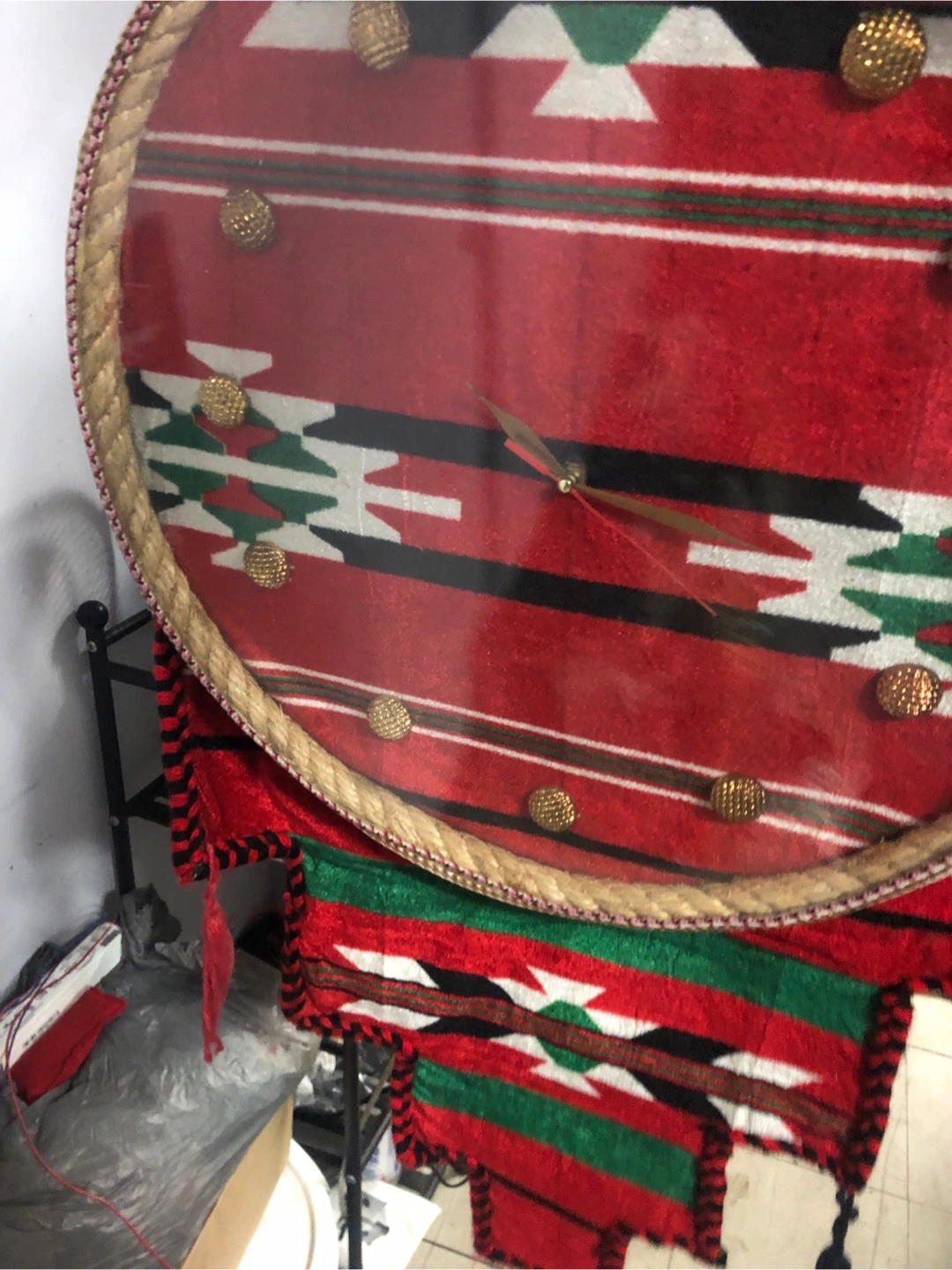 78Large round wall clock. Features a red, green, and black patterned face. Wooden backing. Gold coloured accents. Hanging feature on the back.