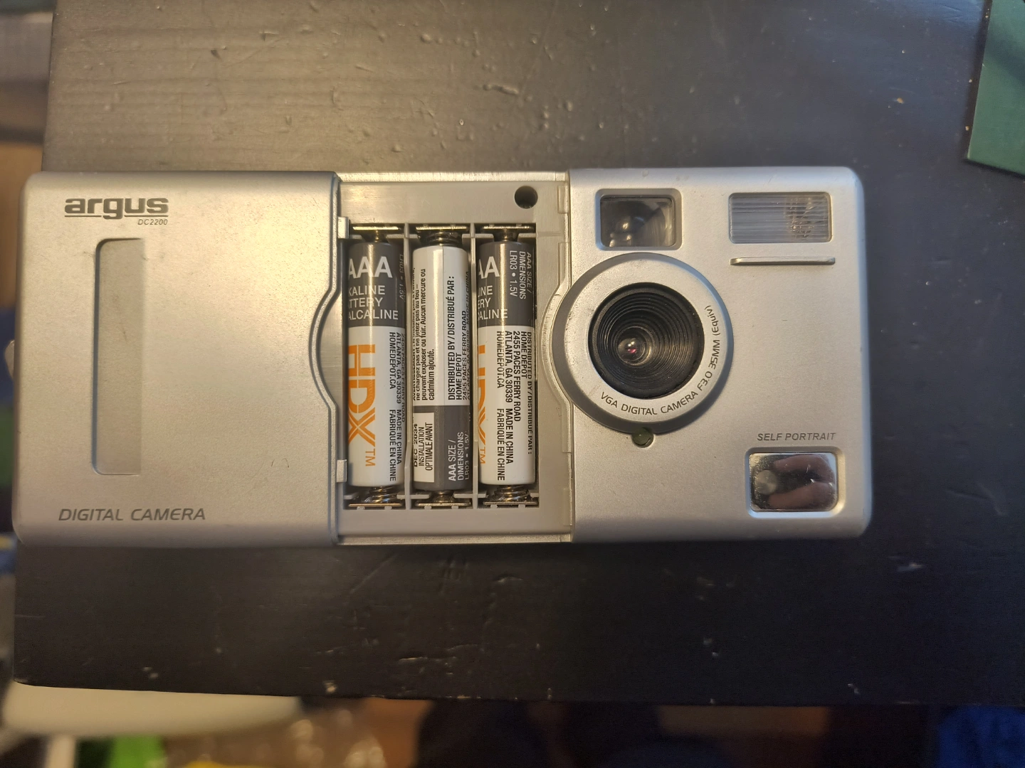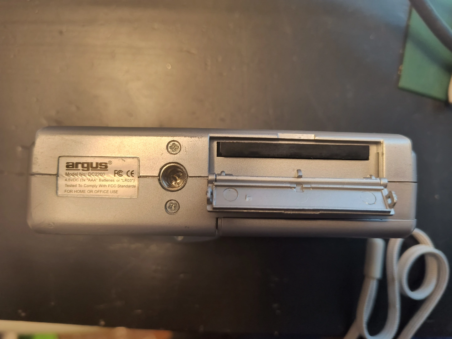 Works well. Accepts a CF card, takes 3 AAA batteries. Seems to be from around 1999 judging by the user's guide online. It's an Argus DC2200. I will include batteries if you pay full price. I can also include a 256mb CF card for an extra $5.