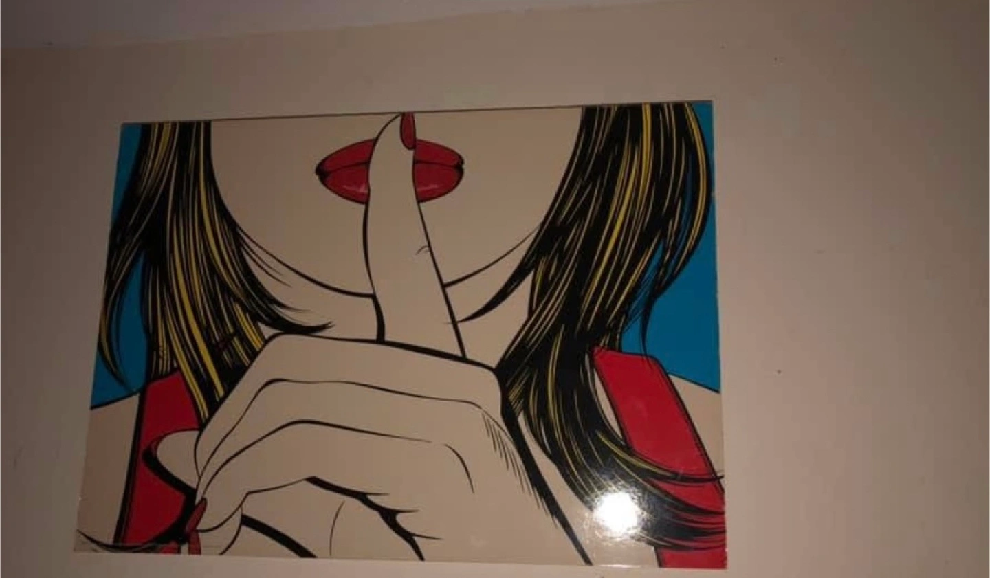 18Vibrant pop art style canvas print. Features a woman with finger to lips. Great for adding a pop of colour to any room.