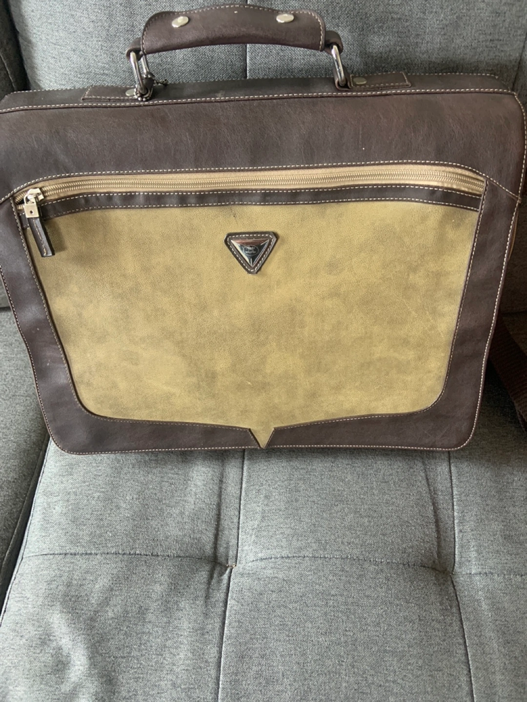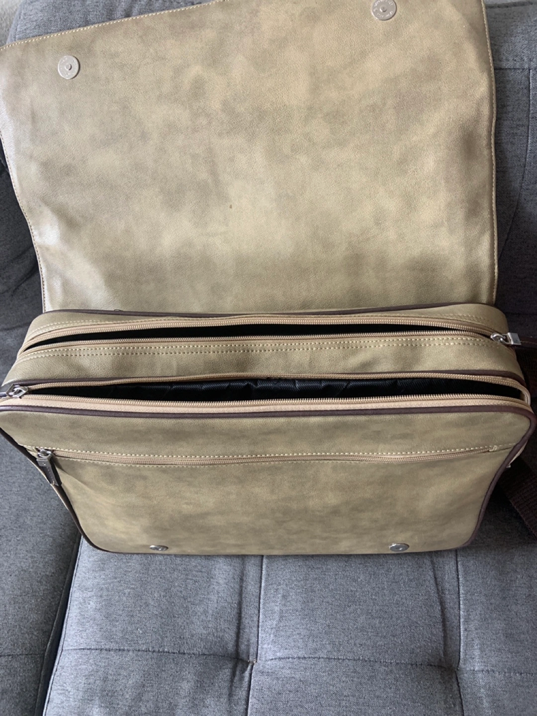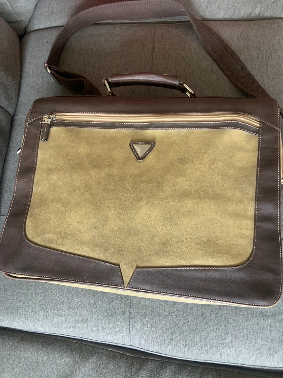 636Large messenger bag. Beige and brown leather-like material. Double zipper closure. Adjustable shoulder strap. Top handle. Interior pockets.