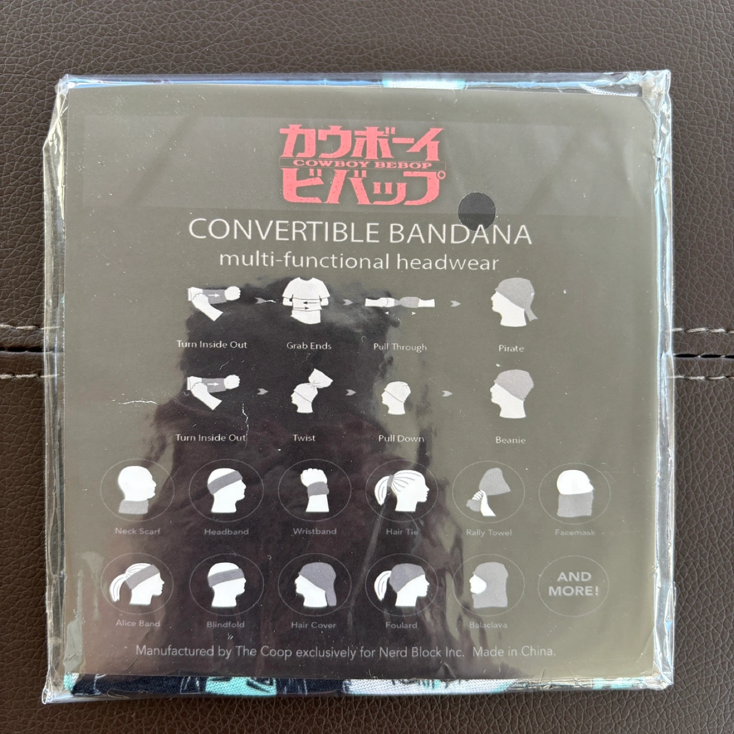New, never used. Features Cowboy Bebop characters. Multifunctional design; can be worn in many ways. Officially licensed by Nerd Block.