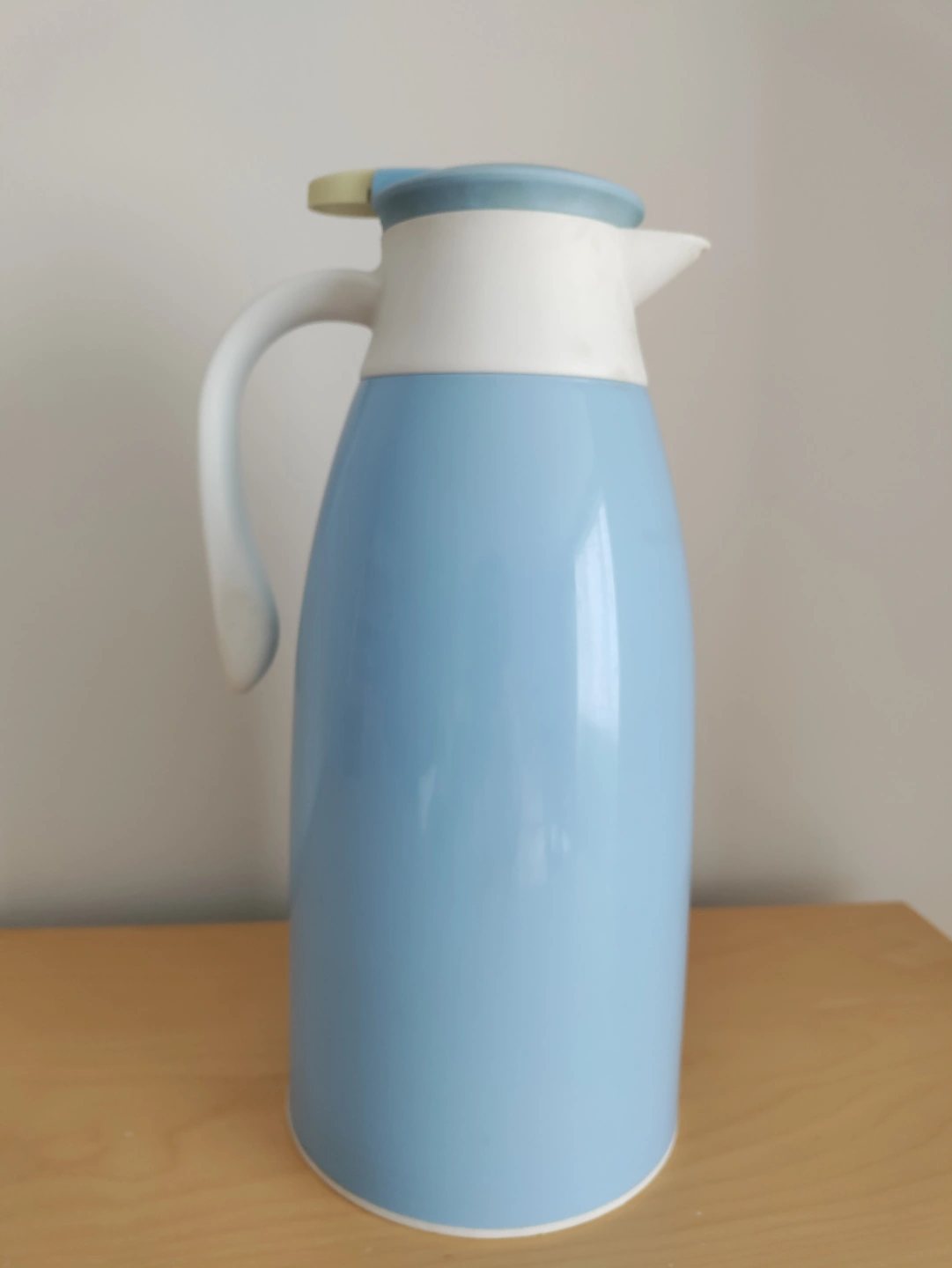 Stylish light blue vacuum insulated carafe. Features a comfortable handle and a flip-top lid. Keeps beverages hot or cold for hours. Perfect for serving coffee, tea, or other drinks.