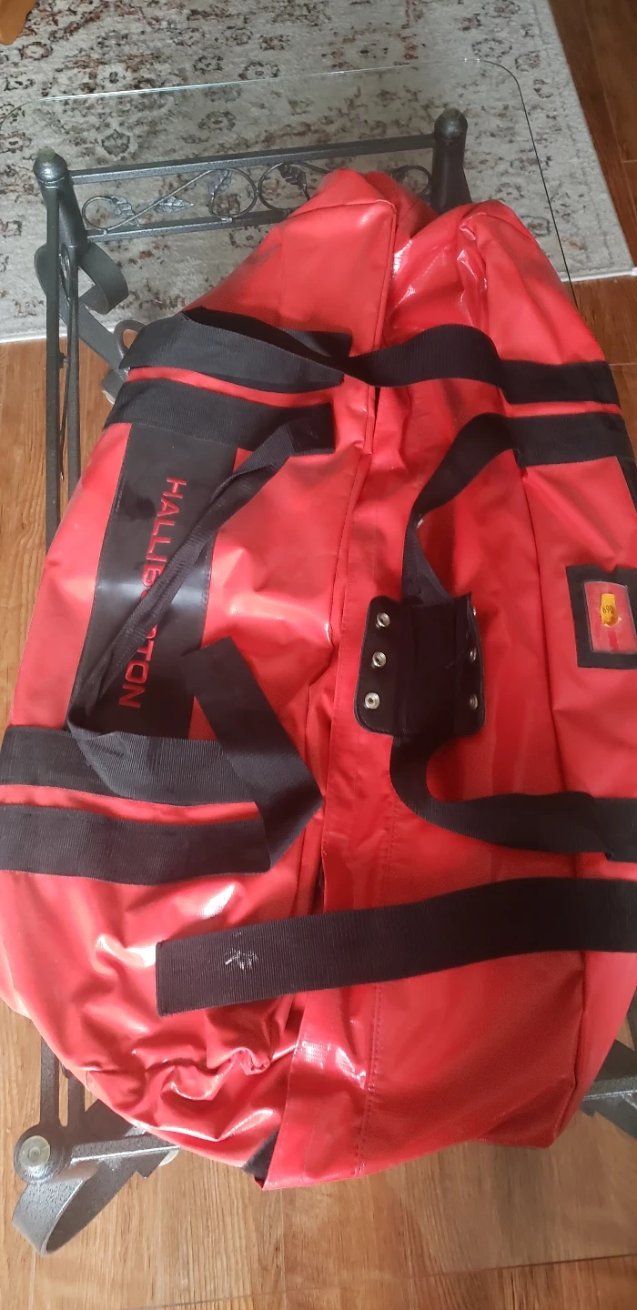 Large red duffle bag. Black accents. Multiple straps. Waterproof material. Great for travel or sports. Use to work for Halliburton. These are great for the Rig guys. I have 2 bags, $30 each or both for $50.